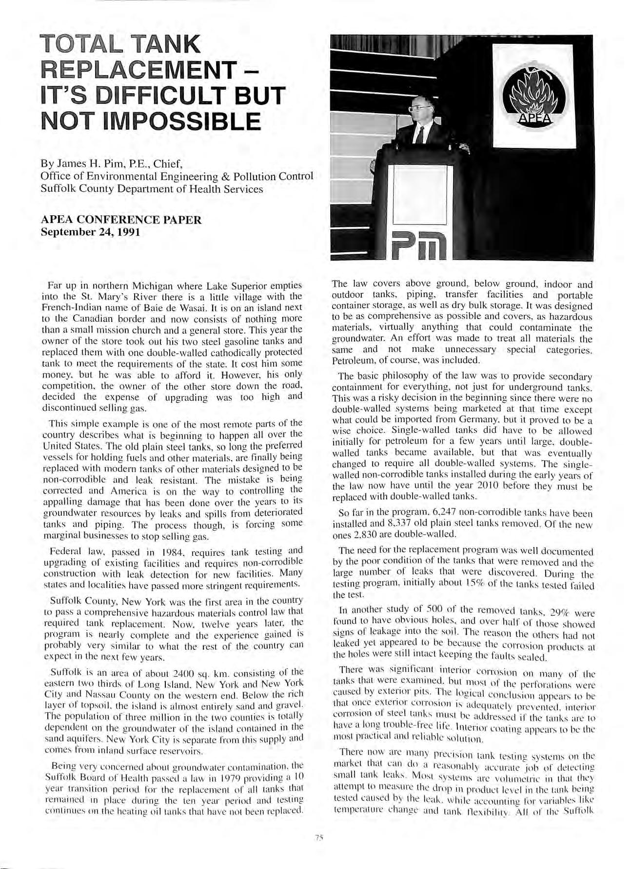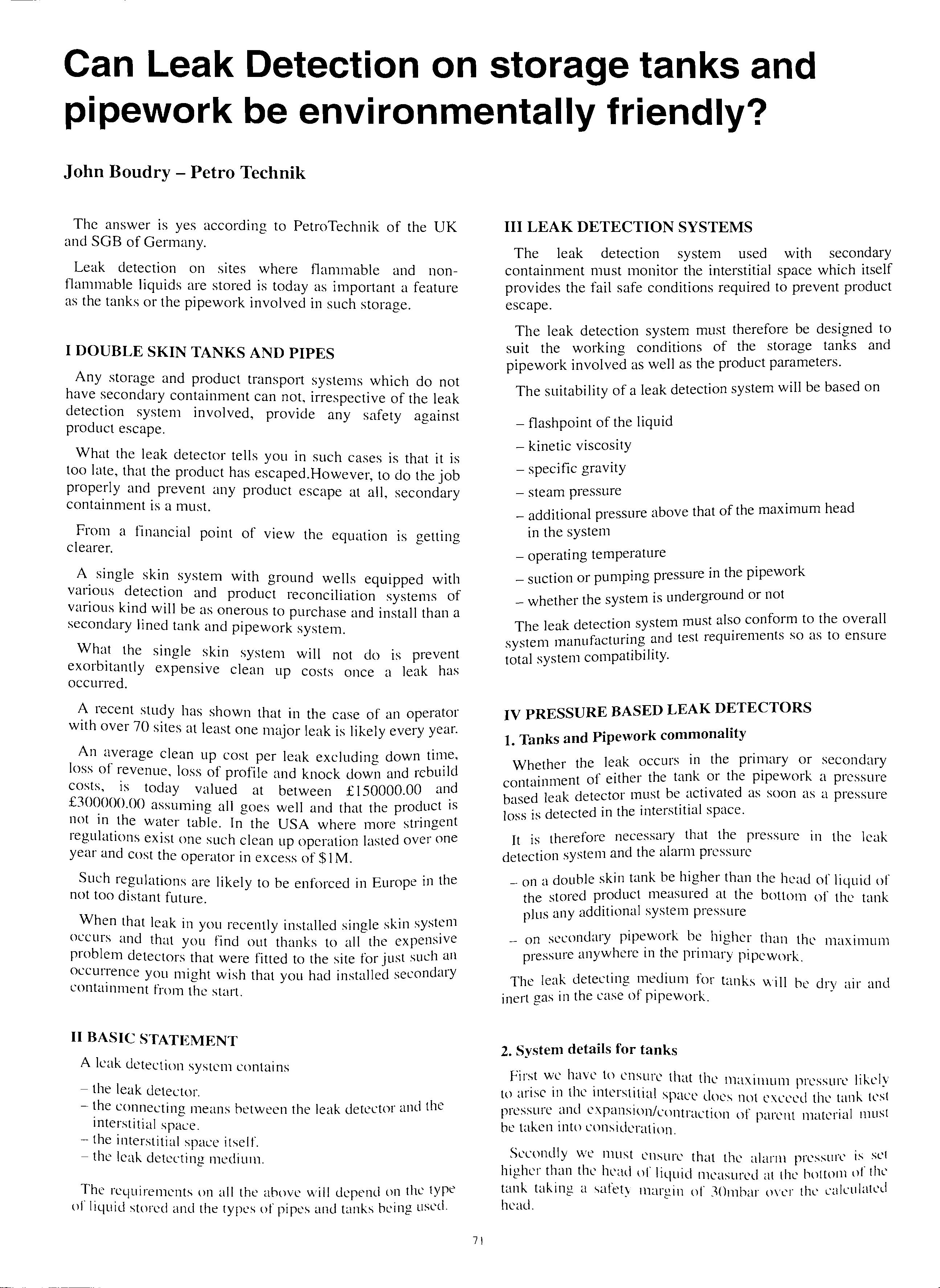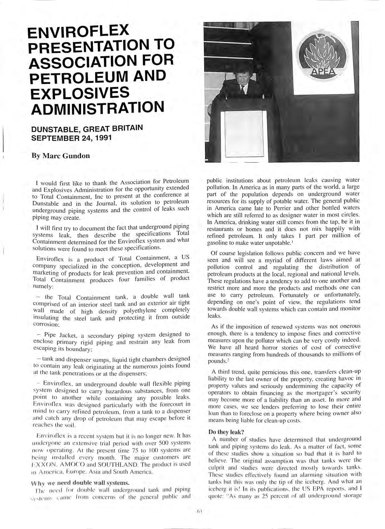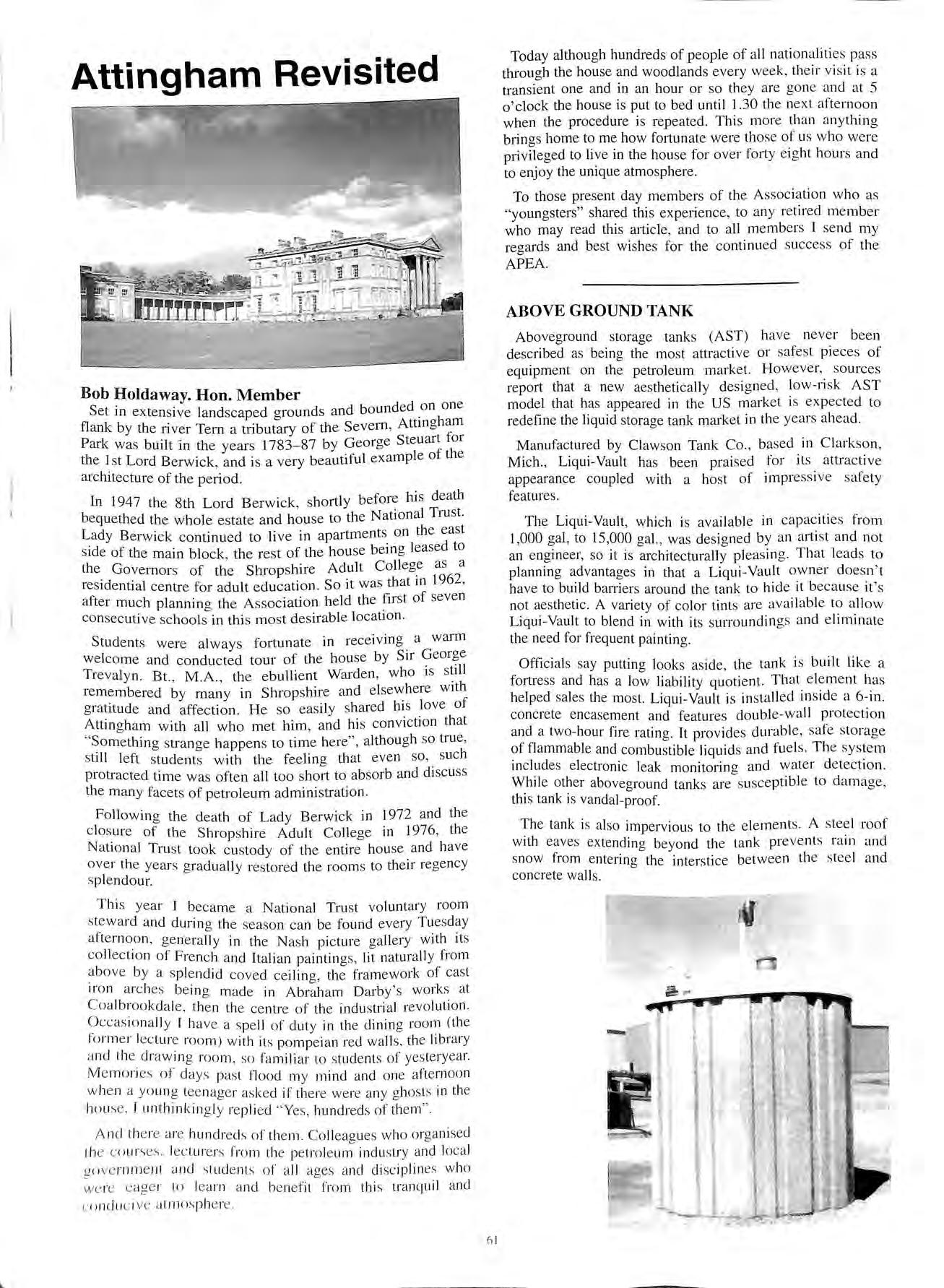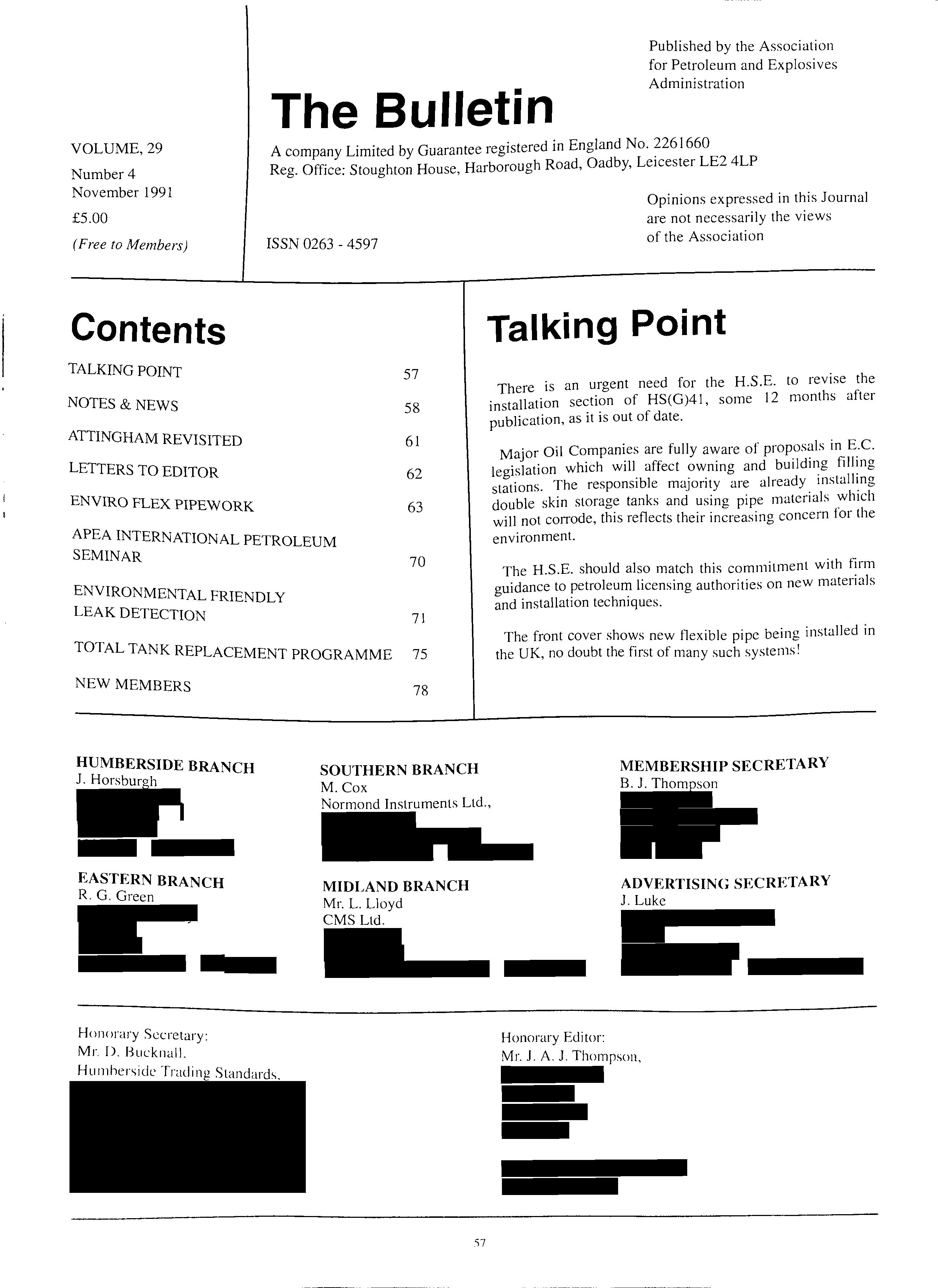 the Association Contents Talking Point TALKING POINT NOTES &NEWS ATTINGHAM REVISITED LETTERS TO EDITOR ENVIRO FLEX PIPEWORK 57 58 61 62 63 APEA INTERNATIONAL PETROLEUM SEMINAR 70 ENVIRONMENTAL FRIENDLY LEAK DETECTION 71 TOTAL TANK REPLACEMENT PROGRAMME NEW MEMBERS 75 78 HUMBERSIDE BRANCH J. Horsburgh