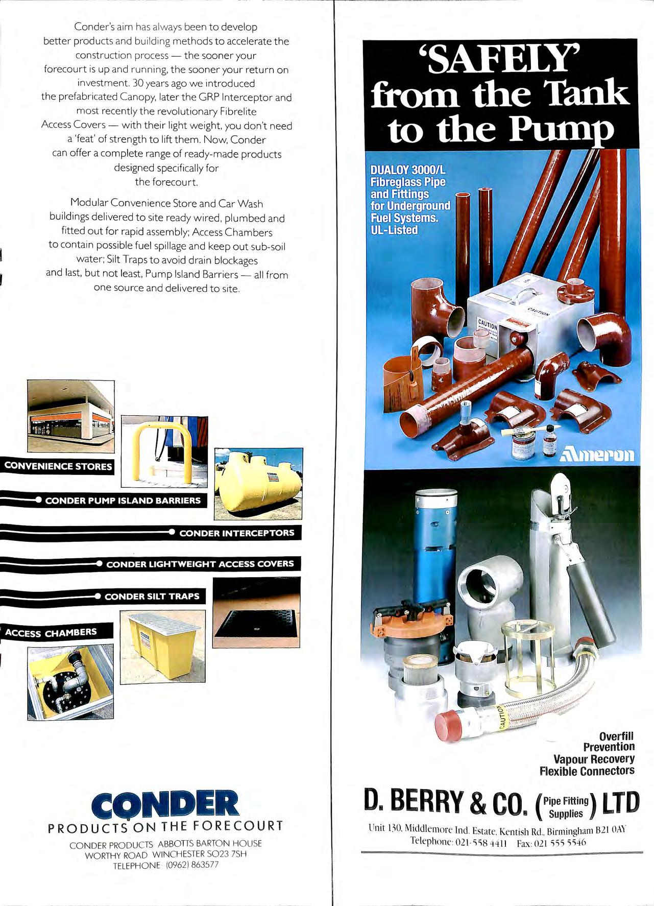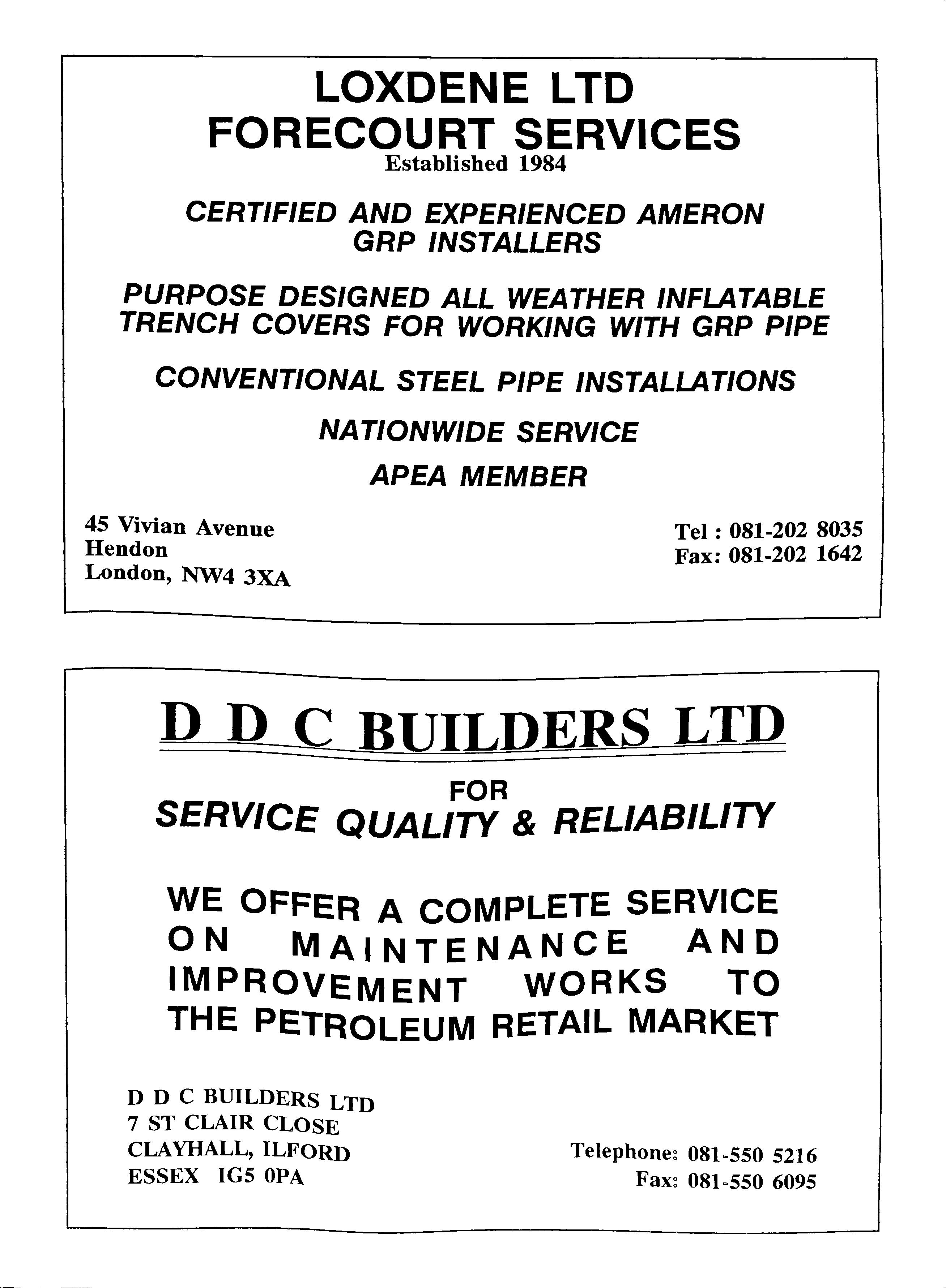 LOXDENE LTD FORECOURT SERVICES Established 1984 CERTIFIED AND EXPERIENCED AMERON GRP INSTALLERS PURPOSE DESIGNED ALL WEATHER INFLATABLE TRENCH COVERS FOR WORKING WITH GRP PIPE CONVENTIONAL STEEL PIPE INSTALLATIONS NATIONWIDE SERVICE APEA MEMBER 45 Vivian Avenue Hendon London, NW4 3XA Tel : 081-202 8035 Fax: 081-202 1642 D D C BUILDERS LTD FOR SERVICE QUALITY & RELIABILITY WE OFFER A COMPLETE SERVICE ON MAINTENANCE AND IMPROVEMENT WORKS TO THE PETROLEUM RETAIL MARKET D DC BUILDERS LTD 7 ST CLAIR CLOSE CLAYHALL, ILFORD ESSEX IG5 OPA 081=550 5216 081 =550 6095