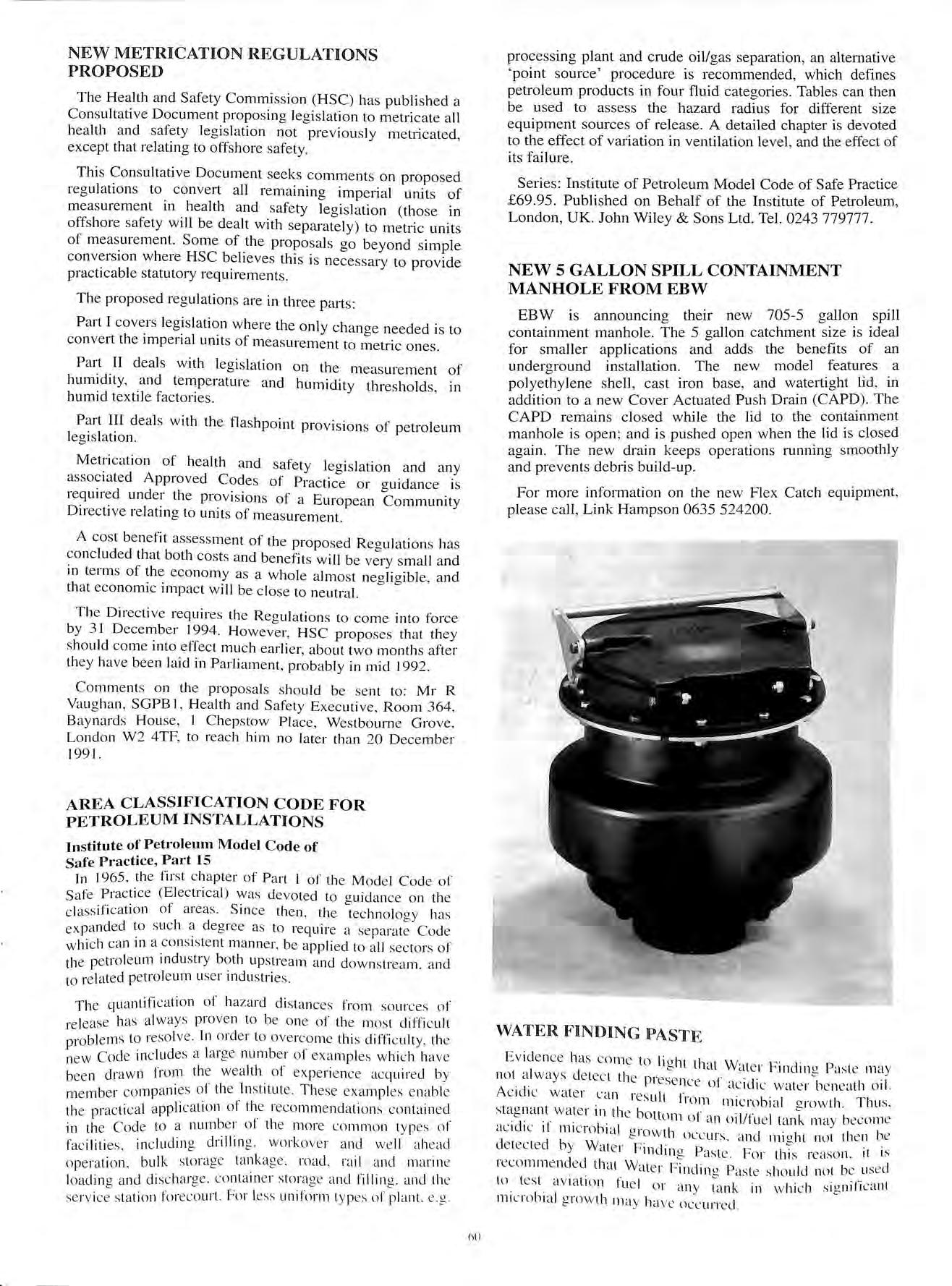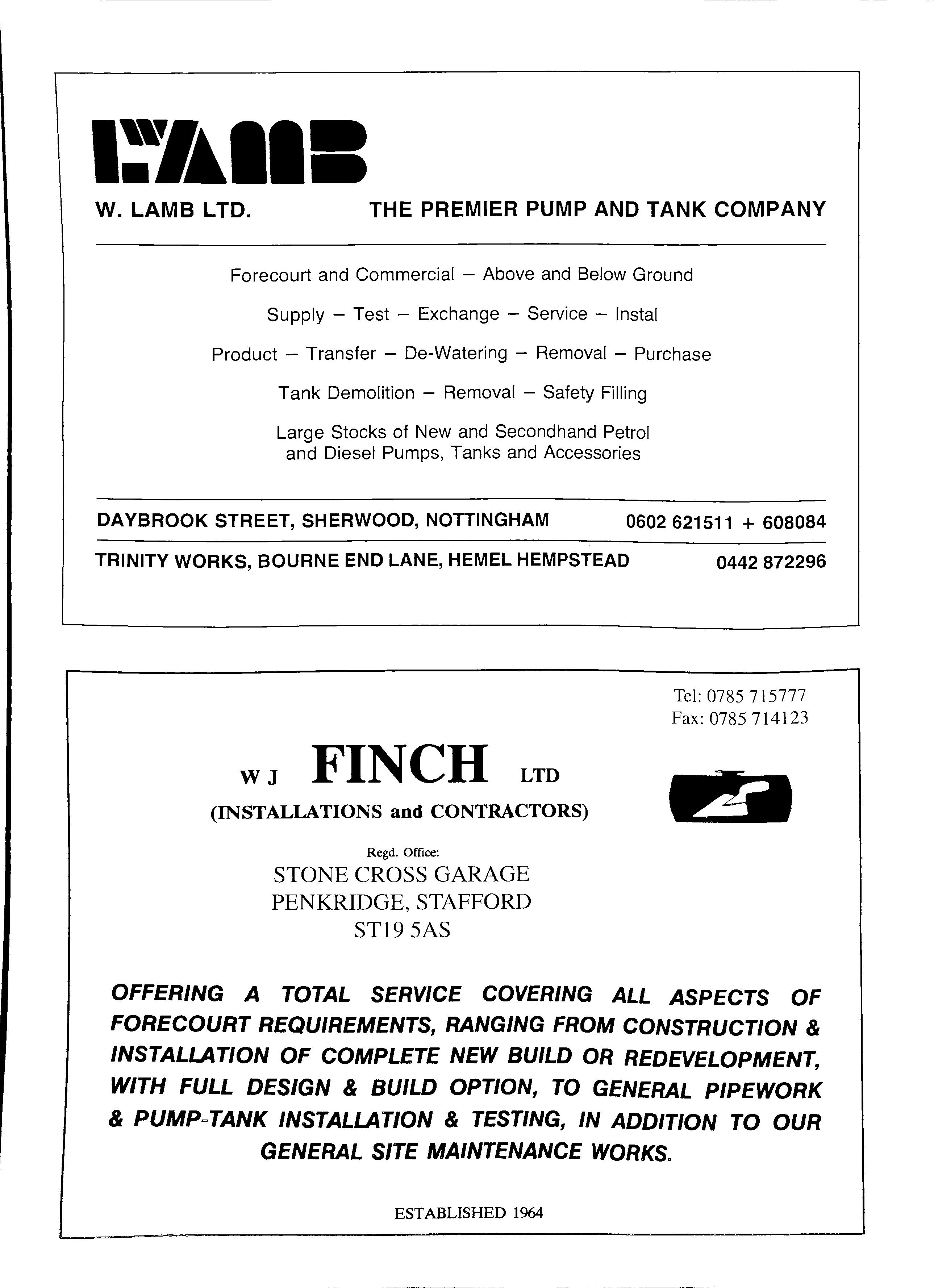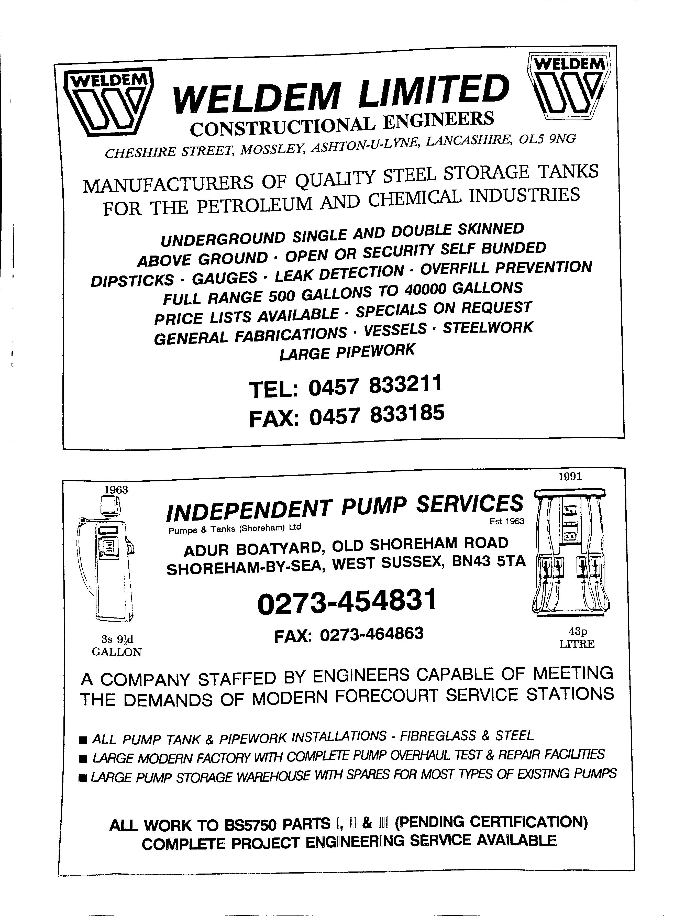 WELDEM LIMITED CONSTRUCTIONAL ENGINEERS CHESHIRE STREET, MOSSLEY, ASHTON-U-LYNE, LANCASHIRE, OL5 9NG MANUFACTURERS OF QUALI1Y STEEL STORAGE TANKS FOR THE PETROLEUM AND CHEMICAL INDUSTRIES UNDERGROUND SINGLE AND DOUBLE SKINNED ABOVE GROUND · OPEN OR SECURITY SELF BUNDED DIPSTICKS • GAUGES • LEAK DETECTION • OVERFILL PREVENTION FULL RANGE 500 GALLONS TO 40000 GALLONS 1963 g (i} \ \\ I PRICE LISTS AVAILABLE · SPECIALS ON REQUEST GENERAL FABRICATIONS · VESSELS · STEELWORK LARGE PIPEWORK TEL: 0457 833211 FAX: 0457 833185 INDEPENDENT PUMP SERVICES Pumps & Tanks (Shoreham) Ltd Est 1963 ADUR BOATYARD, OLD SHOREHAM ROAD SHOREHAM-BY-SEA, WEST SUSSEX, BN43 STA 0273-454831 FAX: 0273-464863 1991 43p LITRE A COMPANY STAFFED BY ENGINEERS CAPABLE OF MEETING THE DEMANDS OF MODERN FORECOURT SERVICE STATIONS • ALL PUMP TANK & PIPEWORK INSTALL.A TIONS - FIBREGLASS & STEEL • LARGE MODERN FACTORY WITH COMPJ£TE PUMP OVERHAUL TEST & REPAIR FACILJnES •LARGE PUMP STORAGE WAREHOUSE WITH SPARES FOR MOST TYPES OF EXISTING PUMPS ALL WORK TO BS5750 PARTS & m(PENDING CERTIFICATION} COMPLETE PROJECT ENG~NEER~NG SERVICE AVAILABLE