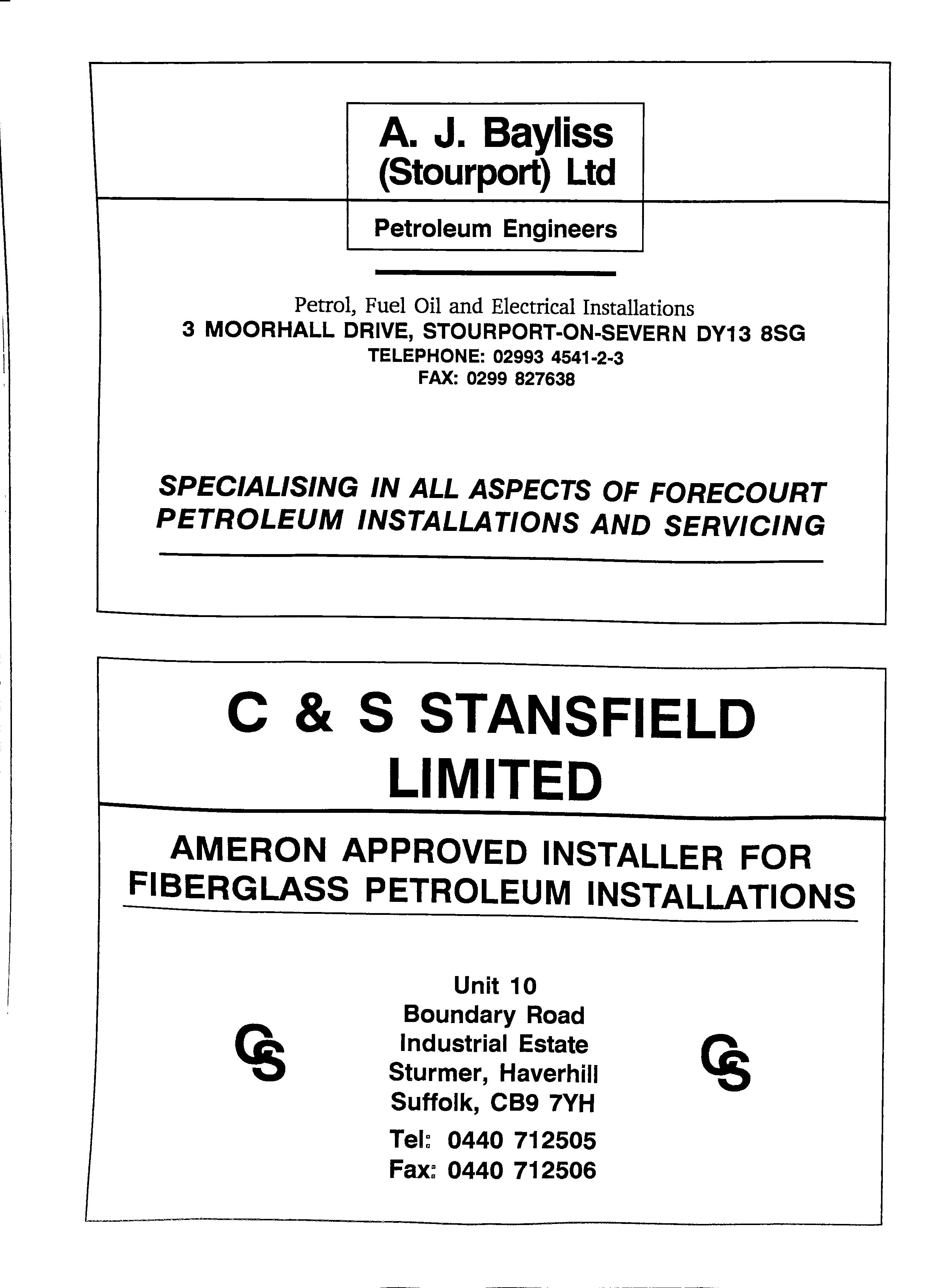 A. J. Bayliss (Stourport) Ltd Petroleum Engineers Petrol, Fuel Oil and Electrical Installations 3 MOORHALL DRIVE, STOURPORT-ON-SEVERN DY13 SSG TELEPHONE: 02993 4541·2·3 FAX: 0299 827638 SPECIALISING IN ALL ASPECTS OF FORECOURT PETROLEUM INSTALLATIONS AND SERVICING C & S STANSFIELD LIMITED AMERON APPROVED INSTALLER FOR FIBERGLASS PETROLEUM INSTALLATIONS Unit 10 Boundary Road Industrial Estate Sturmer, Haverhill Suffolk, CB9 7YH Tel: 0440 712505 Fax: 0440 712506