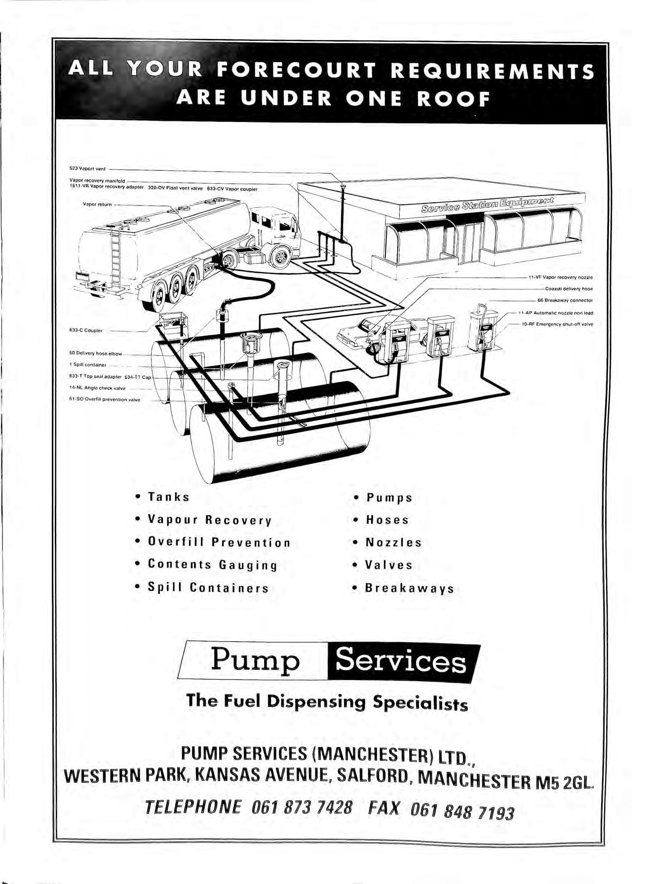 Coaxial delivery l'lose 66 Breakaway connec1or 11 AP Au1oma11c no:t:zle non lead ,- 10-RF Emergency shur-ott valve 633 T Top sea l adapter 634-TT 14 NLAnglecheckvalve "'""""'""""""""''" \\I • Tanks •Vapour Recovery •Overfill Prevention •Contents Gauging •Spill Containers •Pumps •Hoses •Nozzles •Valves •Breakaways / Pump E1511!!J The Fuel Dispensing Specialists PUMP SERVICES (MANCHESTER) LTD,, WESTERN PARK, KANSAS AVENUEu SALFORDg MANCHESTER M5 2GL TELEPHONE 061 873 7428 FAX 061 848 7193