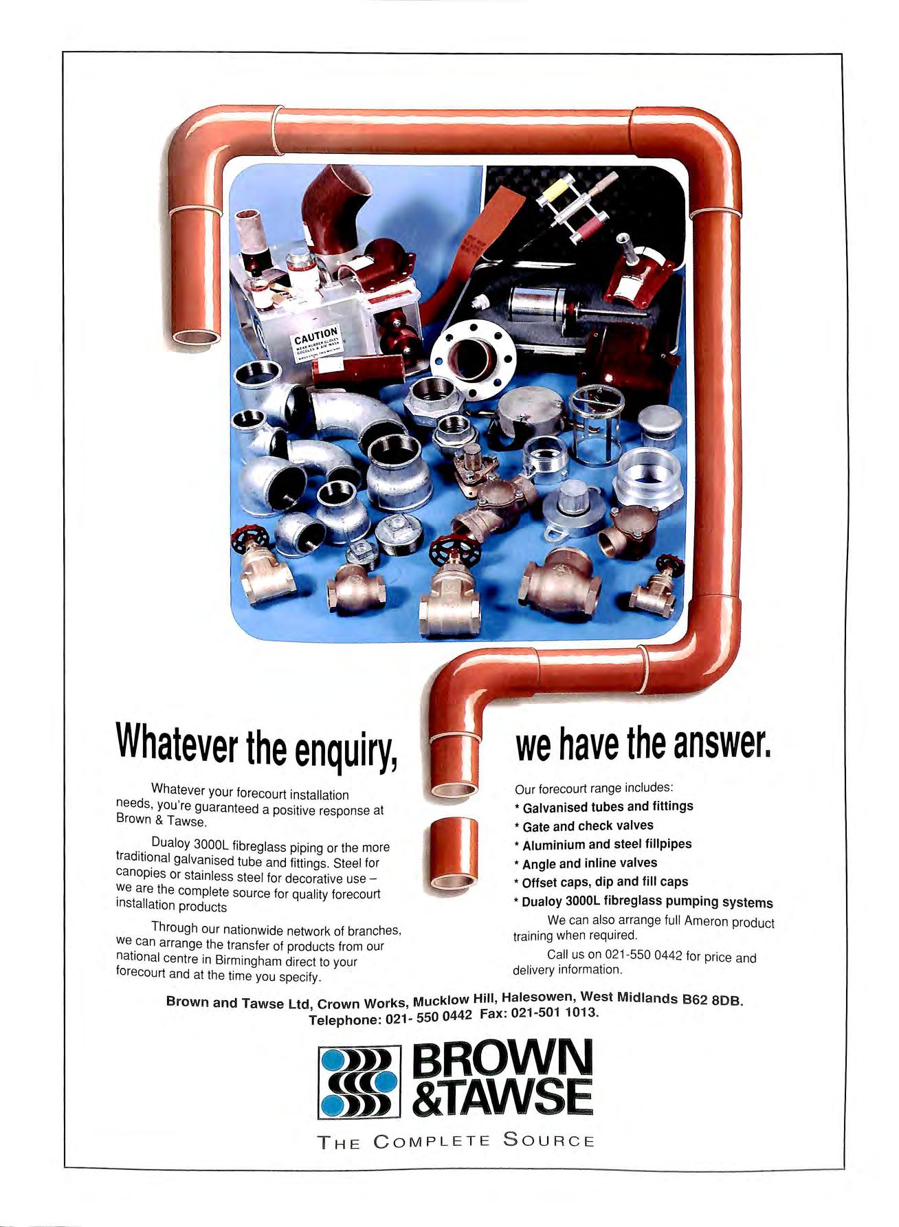 Whatever the enquiry, we have the answer. Whatever your forecourt installation needs you're gu 1 B · aran eed a positive response at rown & Tawse * Gate and check valves Our forecourt range includes: * Galvanised tubes and fittings Ira Dualoy 3000L fibreglass piping or the more *Aluminium and steel fillpipes ditional galvanised tube and fittings. Steel for • Angle and inline valves canopies or stainless steel for decorative use we are the I * Offset caps, dip and fill caps compete source for quality forecourt installation products * Dualoy 3000L fibreglass pumping systems Through our nationwide network of branches We can also arrange full Ameren product we can arr th ' training when required. ange e transfer of products from our national centre in Birmingham direct to your Call us on 021 550 0442 for price and forecourt and at the time you specify delivery information Brown and Tawse Ltd, Crown Works, Mucklow Hill, Halesowen, West Midlands 862 808 . Telephone: 021 550 0442 Fax: 021-501 1013 BROWN &TAWSE THE C OMPLETE S OURCE