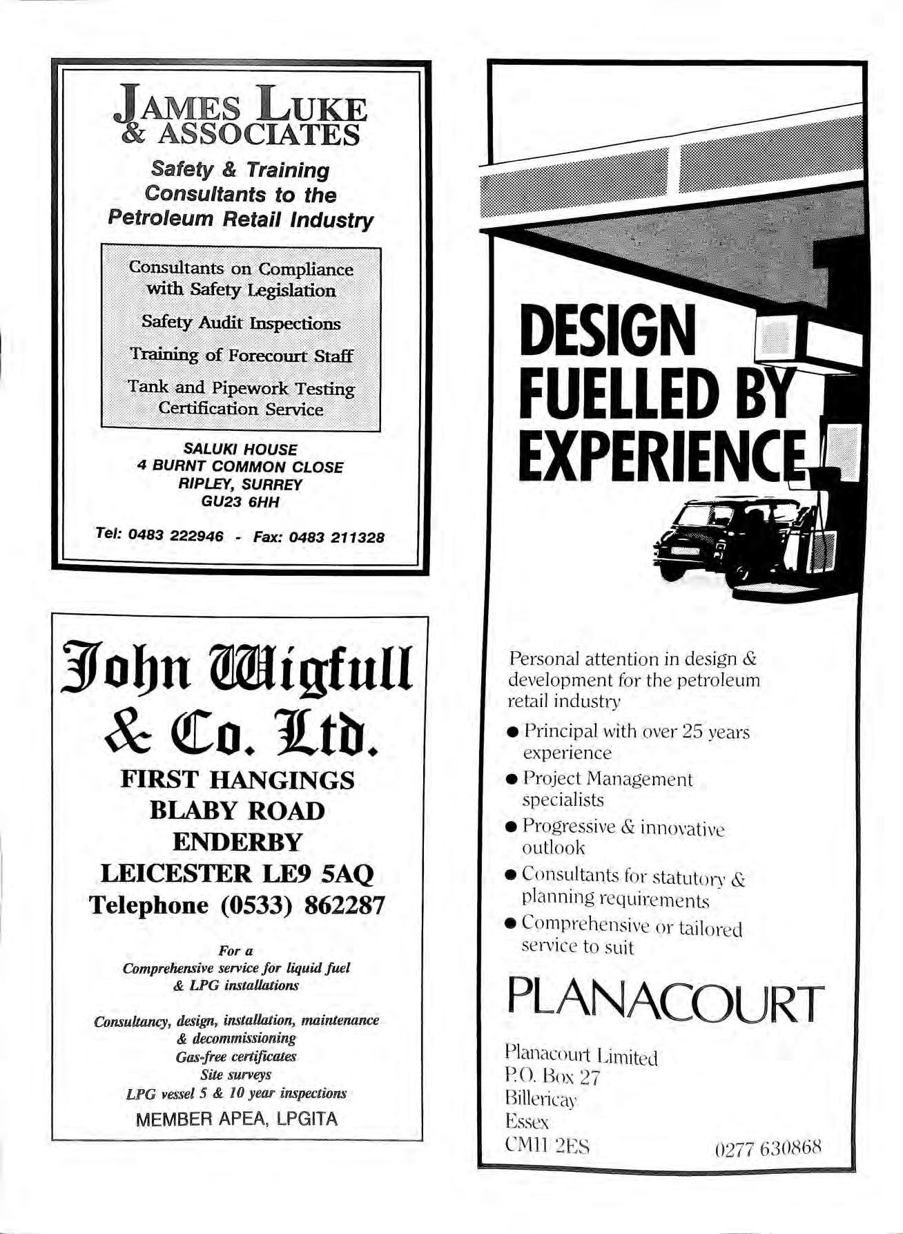 TAMES LUKE Safety & Training Consultants to the Petroleum Retail Industry !: llllllllt11111tllI u > §fl ll11111111111i1lll11 11 1 SALUKI HOUSE 4 BURNT COMMON CLOSE RIPLEY, SURREY GU23 6HH Tel: 0483 222946 - Fax: 0483 211328 Jf obn Migfull & <!o. lltb. FIRST HANGINGS BLABY ROAD ENDERBY LEICESTER LE9 SAQ Telephone (0533) 862287 Fora Comprehensive service for liquid fuel & LPG installations Consullancy, design, installation, maintenance & decommissioning Gasafree certificates Site surveys LPG vessel 5 & JO year inspections MEMBER APEA, LPGITA DESIGN FUELLED B EXPERIENC Personal attention in design & development for the petroleum retail industry • Principal with over 25 years experience • Project Management specialists •Progressive & innovativ e outlook •Consultants for statutory & planning requireme nt-; • Comprehensive or tailored service to suit PLANACOURT Planacourt Limited PO Box 27 Bille1icay Essex CMll 2ES 0277 630868