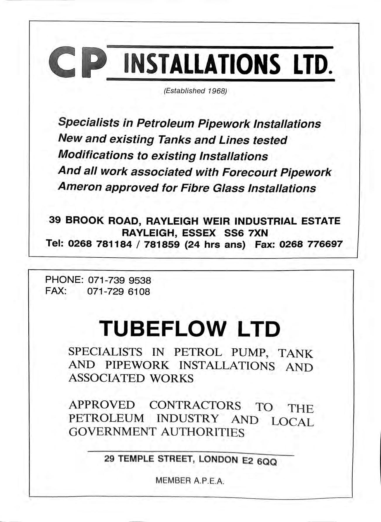 C p INSTALLATIONS LTD. (Established 1968) Specialists in Petroleum Pipework Installations New and existing Tanks and Lines tested Modifications to existing Installations And all work associated with Forecourt Pipework Ameron approved for Fibre Glass Installations 39 BROOK ROAD, RAYLEIGH WEIR INDUSTRIAL ESTATE RAYLEIGH, ESSEX SS6 7XN Tel: 0268 781184 / 781859 (24 hrs ans) Fax: 0268 776697 PHONE: 071-739 9538 FAX: 071-729 6108 TUBEFLOW LTD SPECIALISTS IN PETROL PUMP, TANK AND PIPEWORK INSTALLATIONS AND ASSOCIATED WORKS APPROVED CONTRACTORS TO THE PETROLEUM INDUSTRY AND LOCAL GOVERNMENT AUTHORITIES 29 TEMPLE STREET9 LONDON E2 6QQ MEMBER A.P.E.A.