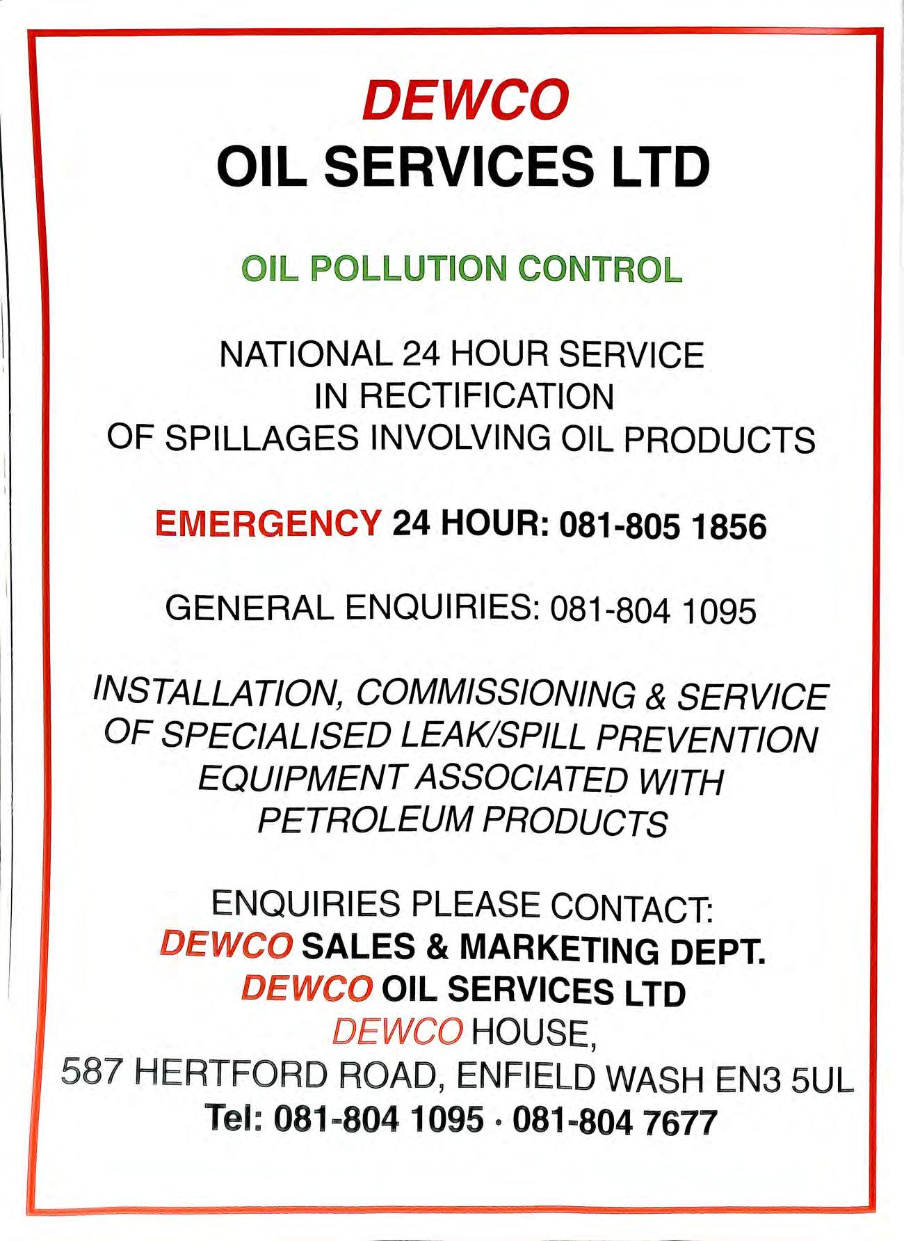 DEWCO OIL SERVICES LTD I N ONTR NATIONAL 24 HOUR SERVICE IN RECTIFICATION OF SPILLAGES INVOLVING OIL PRODUCTS EMERGENCY 24 HOUR: 081-805 1856 GENERAL ENQUIRIES: 081-804 1095 INSTALLATION, COMMISSIONING & SERVICE OF SPECIALISED LEAK/SPILL PREVENTION EQUIPMENT ASSOCIATED WITH PETROLEUM PRODUCTS EN QUIRIES PLEASE CONTACT: DEWCO SALES & MARKETING DEPT. DEWCO OIL SERVICES LTD DEWCO HOUSE , 587 HERTFORD ROAD, ENF IEL D WAS H EN3 SUL Te l : 081-804 1095 · 081 -804 7677