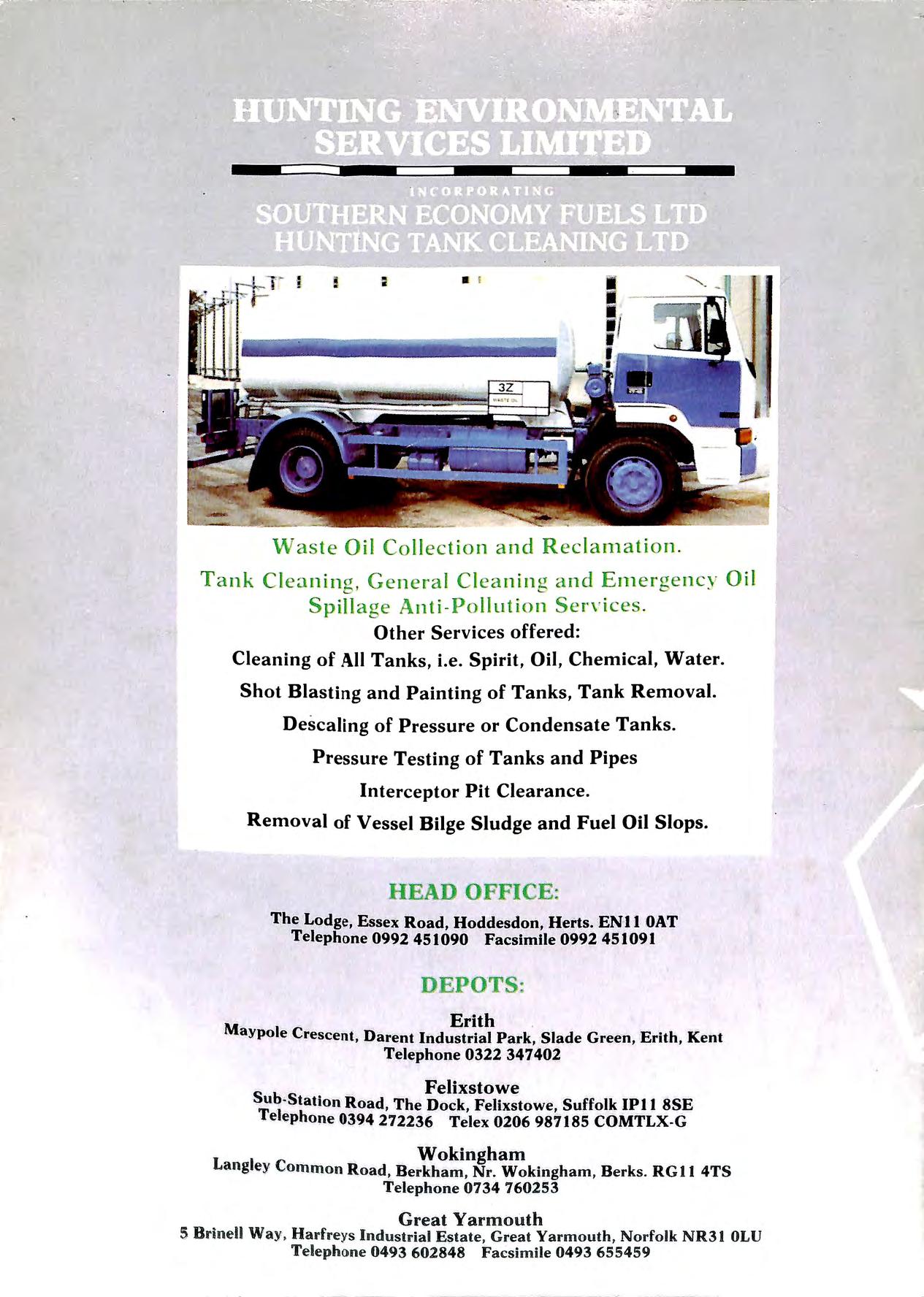 4 -----Waste Oil Collection and Re cl an1ation . Tank Cleaning , General Clean i ng and Einergency O il Spillage A nti Pollution Serdces . Other Services offered: Cleaning of All Tanks, i.e. Spirit, Oil , Chemical, Water. Shot Blasting and Painting of Tanks, Tank Removal. Descaling of Pressure or Condensate Tanks. Pressure Testing of Tanks and Pipes Interceptor Pit Clearance. Removal of Vessel Bilge Sludge and Fuel Oil Slops. HEAD FF CE: The Lodge, Essex Road, Hoddesdon, Herts. ENl 1 OAT Telephone 0992 451090 Facsimile 0992 451091 DEPOTS· M Erith . aypole Crescent, Darent Industrial Park, Slade Green , 'Erith , Kent Telephone 0322 347402 Felixstowe STub 1 Station Road , The Dock , Felixstowe, Suffolk IPI 1 SSE e ephone 0394 272236 Telex 0206 987185 COMTLX-G Wokingham Langley Common R o ad , Be r kham , Nr Wokingham , B er ks RG l 1 4TS Telep h one 0 7 34 7 60253 G re at Ya rm o u th 5 Brinell Way , Harfrey s Indu s tri a l Es t a te, Grea t Ya rmout h , N orfolk NR3 1 OLU Telephone 0 4 9 3 602 848 Fa cs imil e 049 3 6 5 545 9