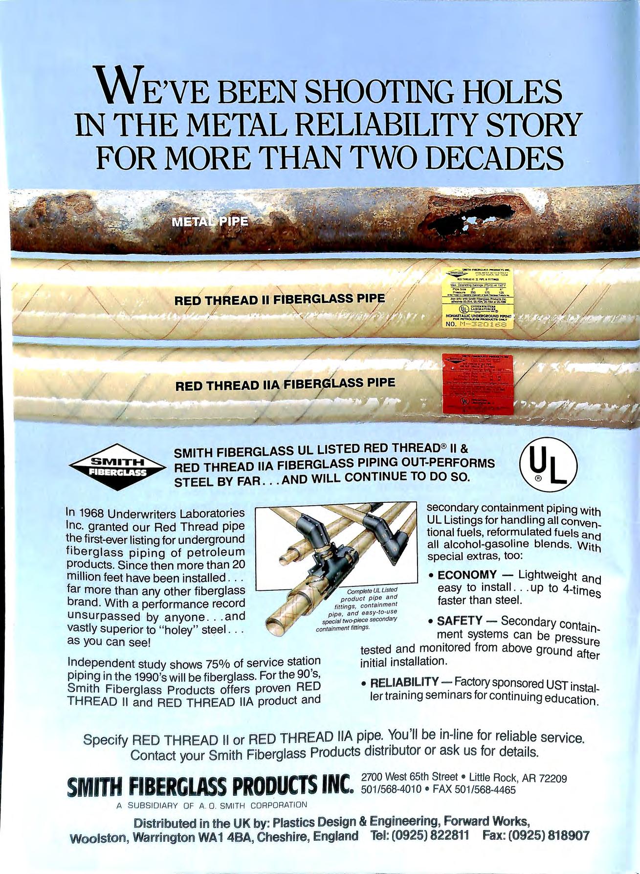 / ./ I WE'VE BEEN SHOOTING ·HOLES IN THE METAL RELIABILITY STORY FOR MORE THAN TWO DECADES SMITH FIBERGLASS UL LISTED RED THREAD® 11 & RED THREAD llA FIBERGLASS PIPING OUT-PERFORMS STEEL BY FAR AND WILL CONTINUE TO DO SO. Complete UL Usted product p i pe and fittings, containment pipe, and easy-to -u se secondary