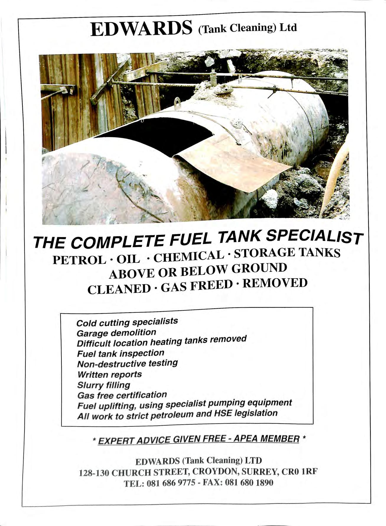 EDWARDS (Tank Cleaning) Ltd THE COMPLETE FUEL TANK SPECIALIST PETROL · OIL · CHEMICAL · STORAGE TANKS ABOVE OR BELOW GROUND CLEANED·GASFREED·REMOVED Cold cutting specialists Garage demolition Difficult location heating tanks removed Fuel tank inspection Non-destructive testing Written reports Slurry filling Gas free certification Fuel uplifting, using specialist pumping equipment All work to strict petroleum and HSE legislation *EXPERT ADVICE GIVEN FREE - APEA MEMBER * EDWARDS (Tank Cleaning) LTD 128=130 CHURCH STREET9 CROYDON 9 SURREY, CRO lRF 081 686 9775 081 680 1890