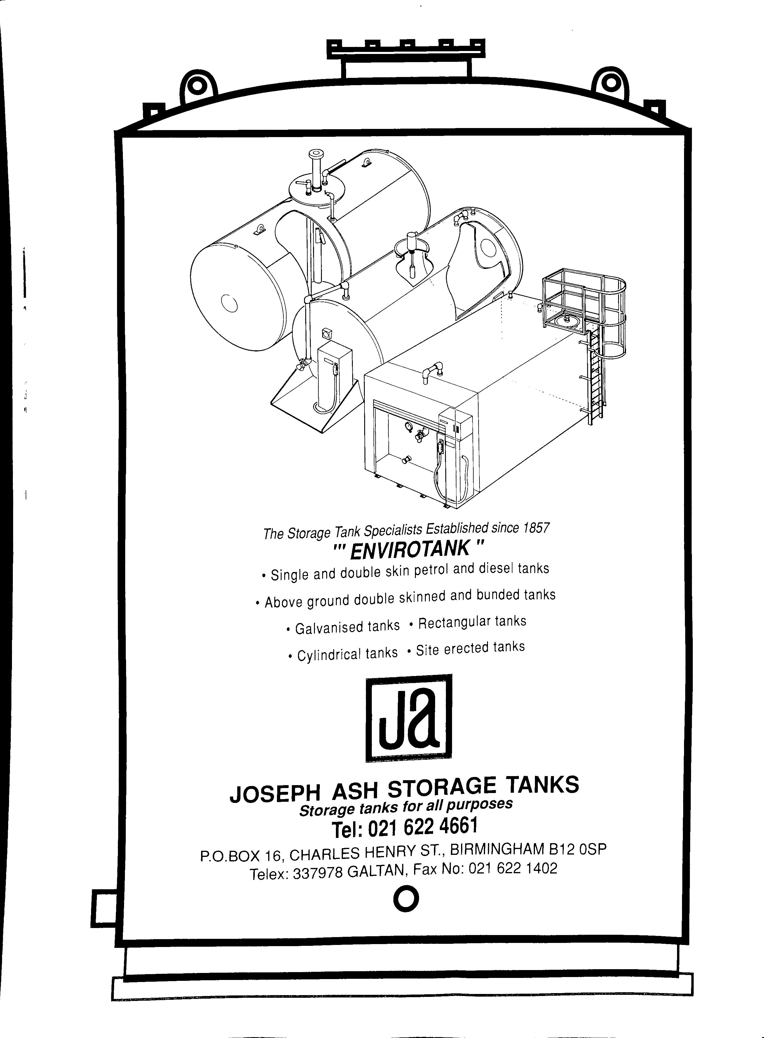 I The Storage Tank Specialists Established since 1857 "' ENVIROTANK " • Single and double skin petrol and diesel tanks • Above ground double skinned and bunded tanks • Galvanised tanks • Rectangular tanks • Cylindrical tanks • Site erected tanks Ja JOSEPH ASH STORAGE TANKS Storage tanks for all purposes Tel: 021 622 4661 PO.BOX 16, CHARLES HENRY ST., BIRMINGHAM 812 OSP Telex: 337978 GALTAN, Fax No: 021 622 1402 0