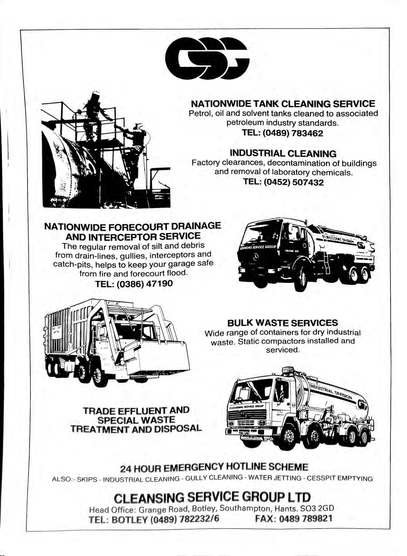 TRADE EFFLUENT AND SPECIAL WASTE TREATMENT AND DISPOSAL 24 HOUR EMERGENCY HOTLINE SCHEME ALSO:- SKIPS INDUSTRIAL CLEANING GULLY CLEANING WATER JETIING CESSPIT EMPTYING CLEANSING SERVICE GROUP LTD Head Office : Grange Road, Botley, Southampton , Hants. 503 2GD TEL: BOTLEY 782232/6 FAX: 0489 789821