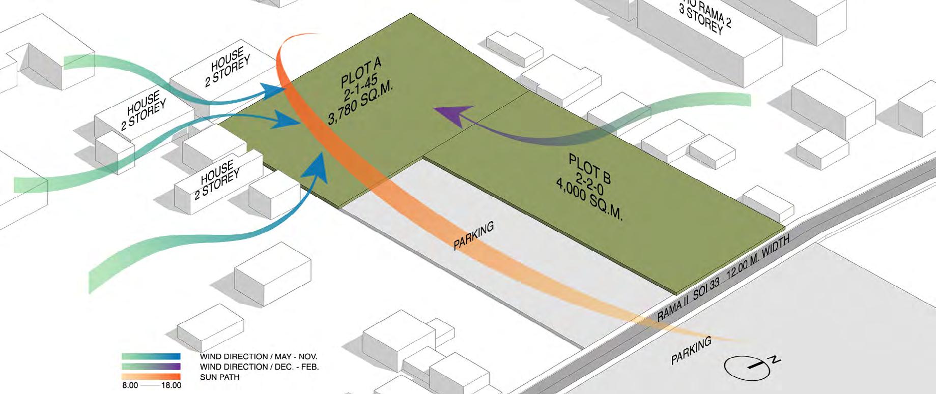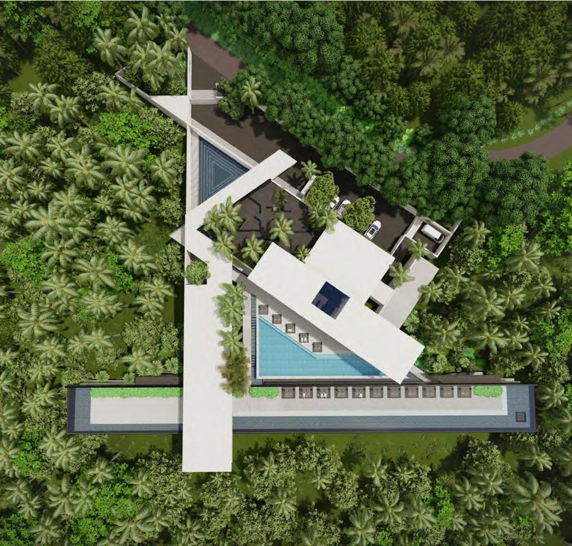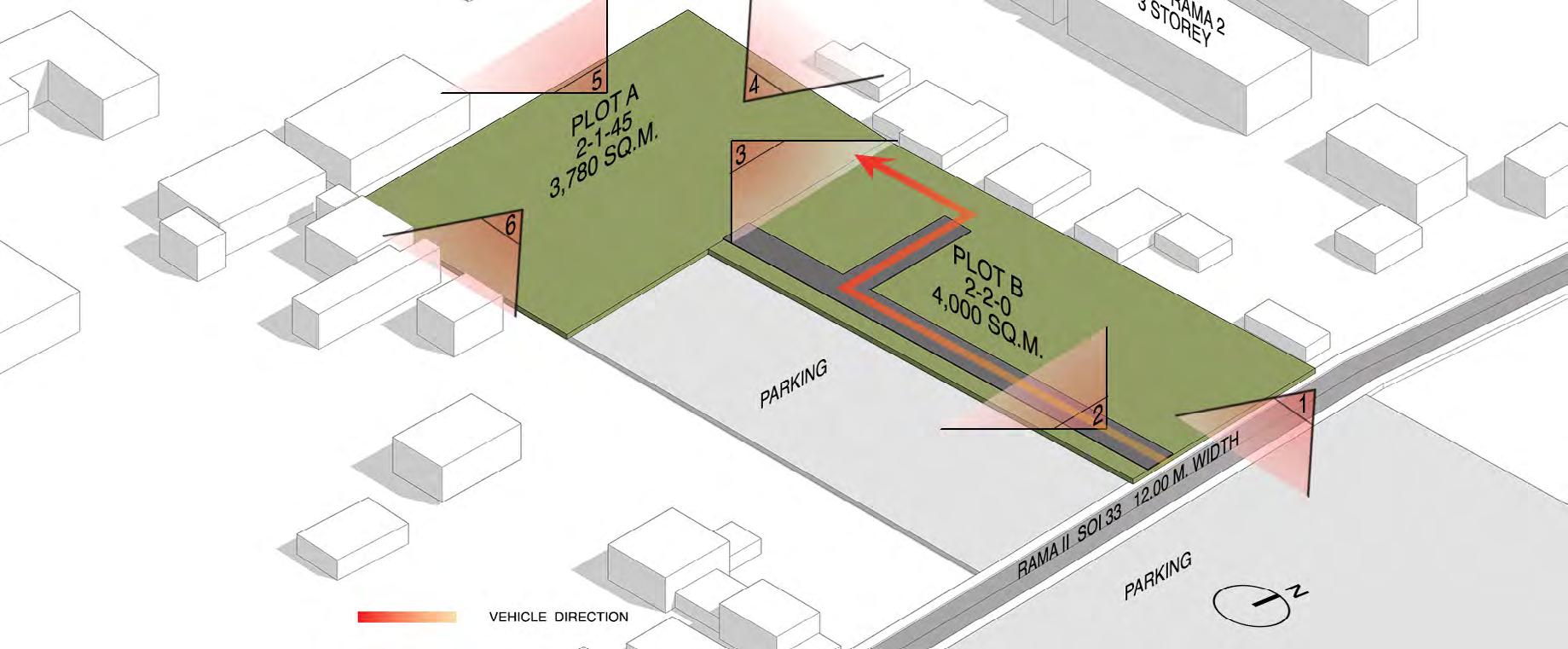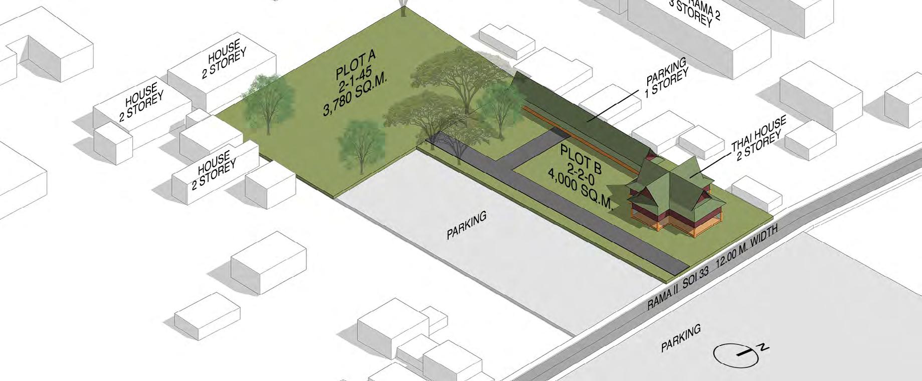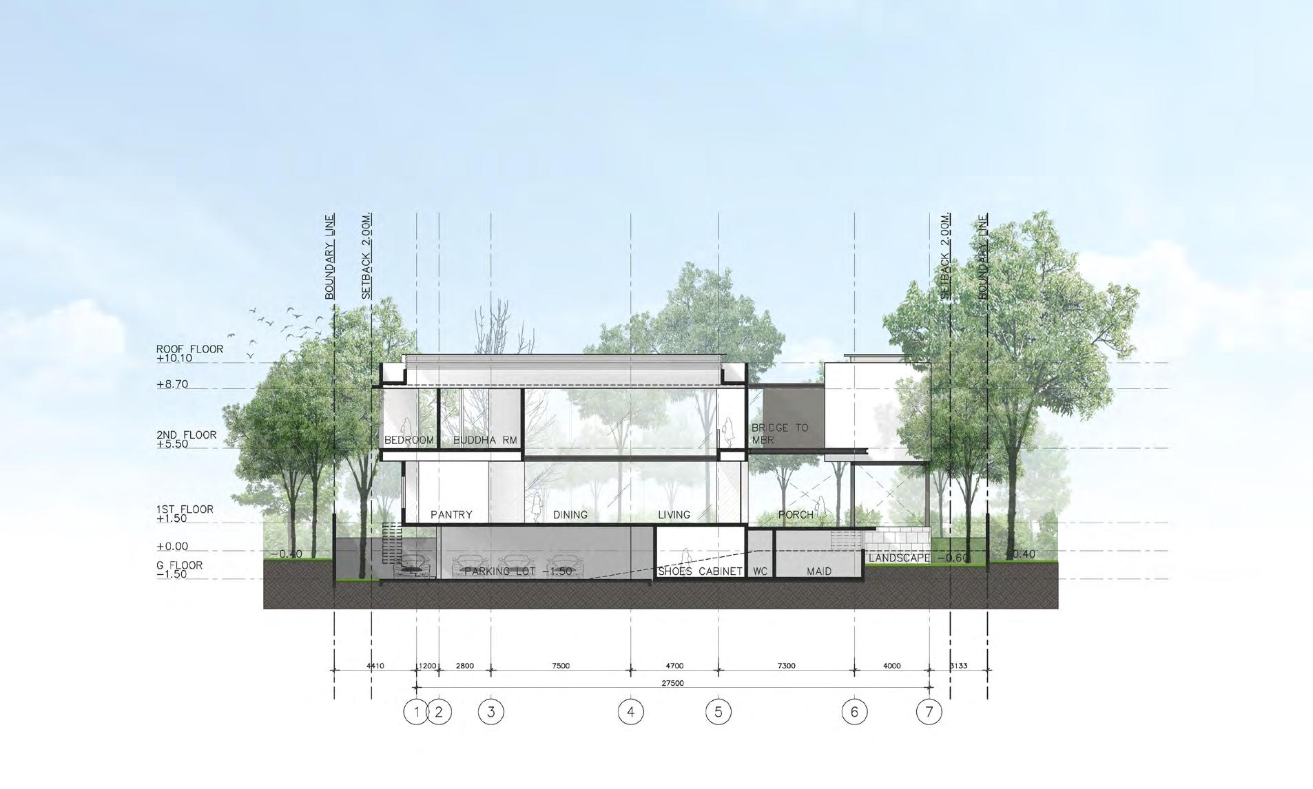 Massing design is an overlap of 2 flipped L-Shape masses and separate zone into 3 zones. Parking lots and service rooms are under the house by -1.50 m. sunken level from drop off and lift up the house to +1.50 m. from drop off.