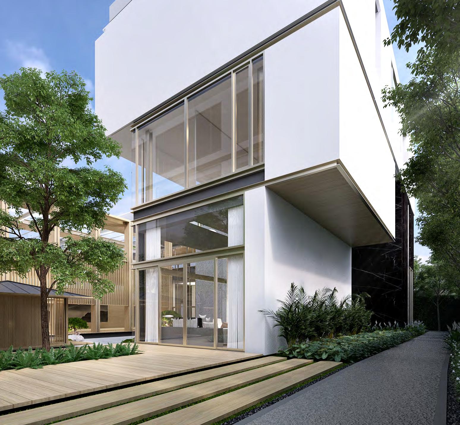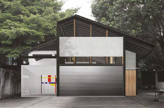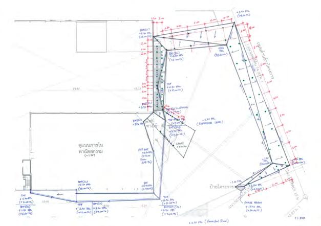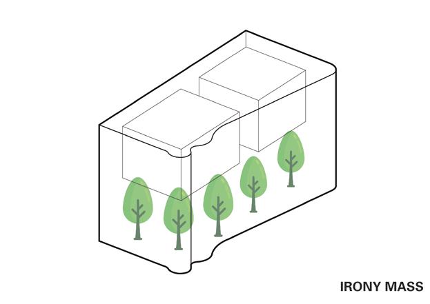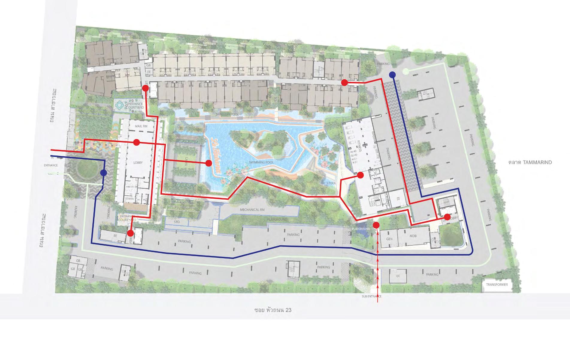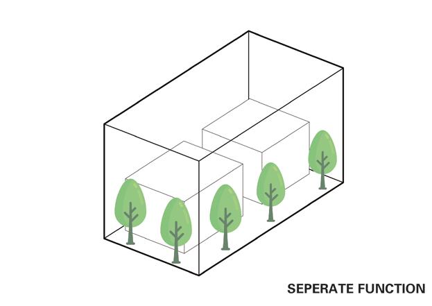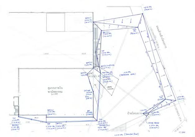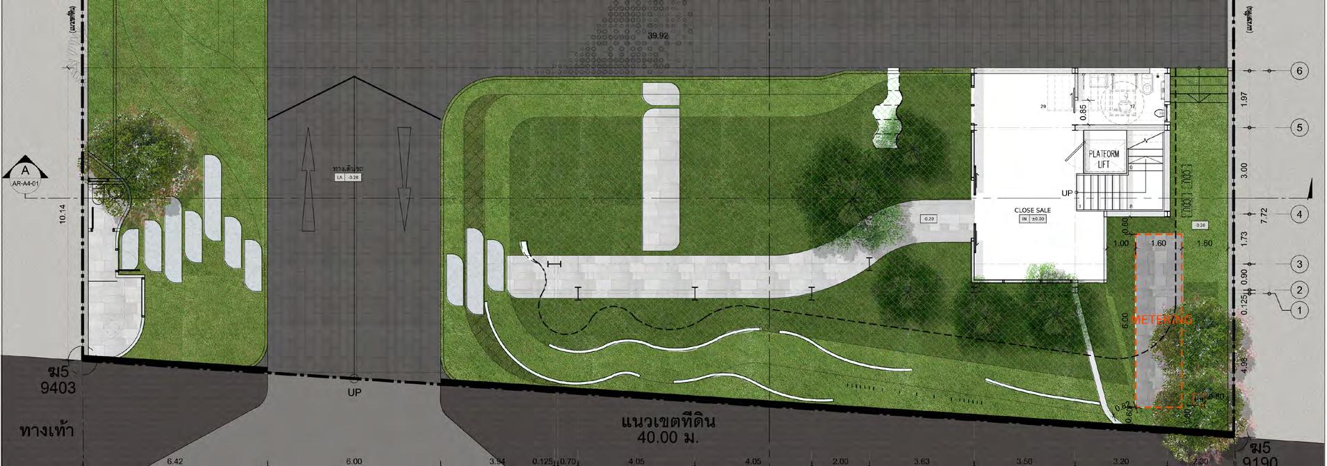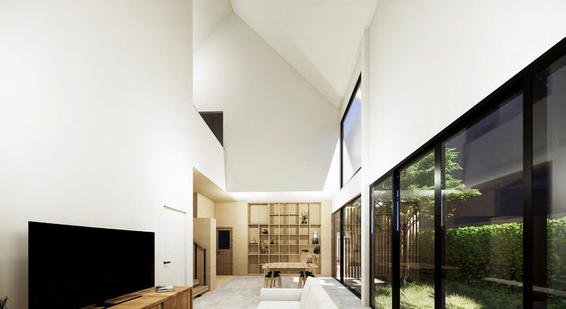 Massing design is an overlap of 2 flipped L-Shape masses and separate zone into 3 zones. Parking lots and service rooms are under the house by -1.50 m. sunken level from drop off and lift up the house to +1.50 m. from drop off.