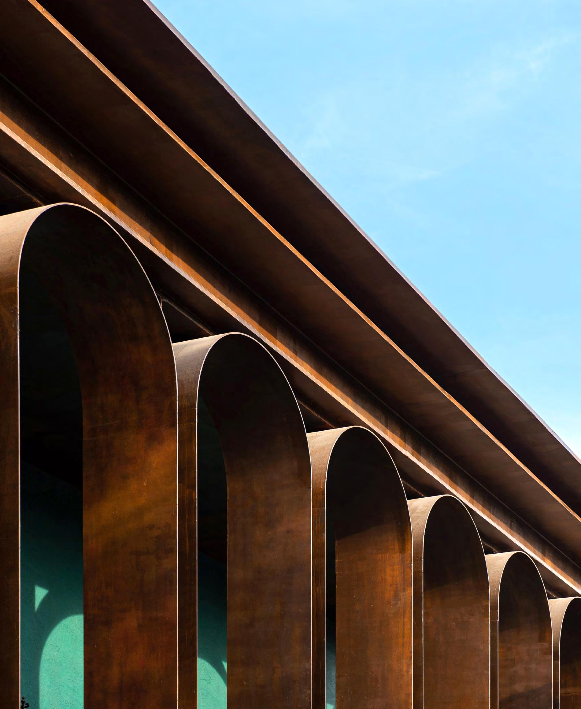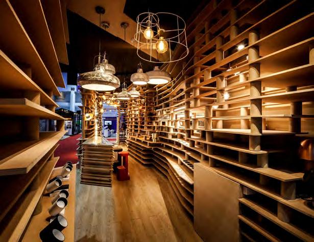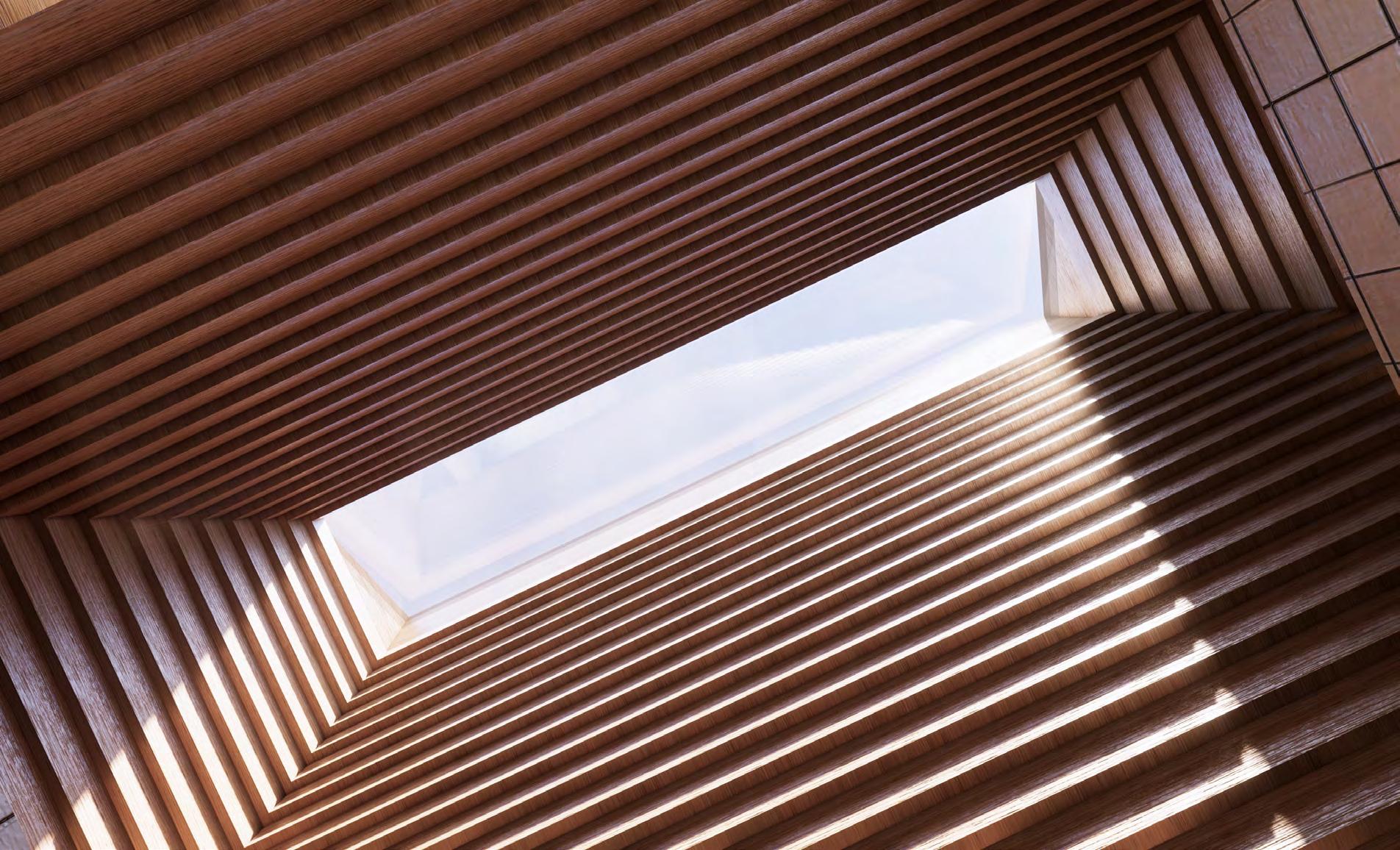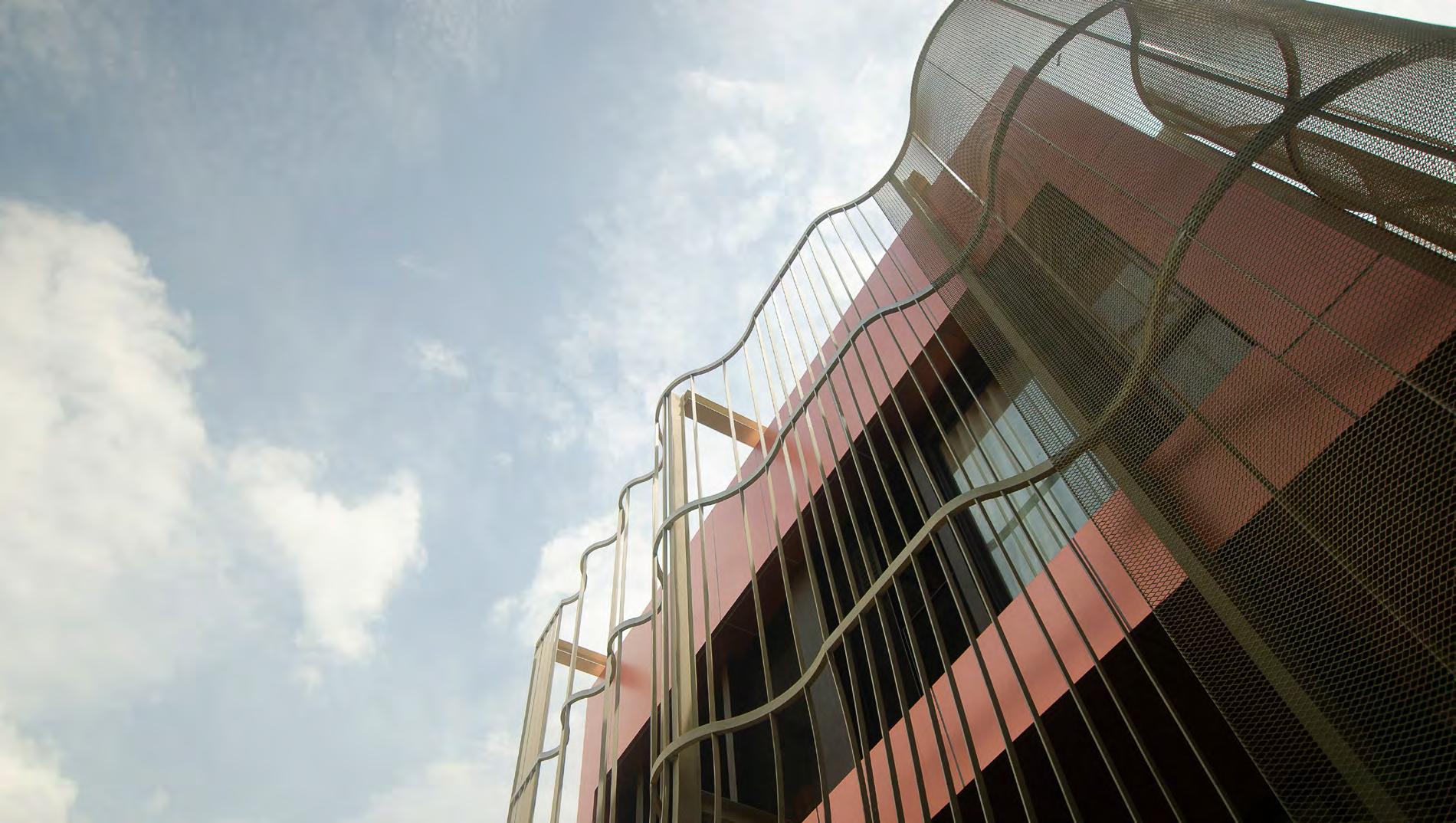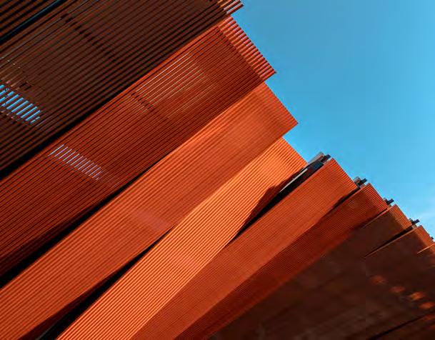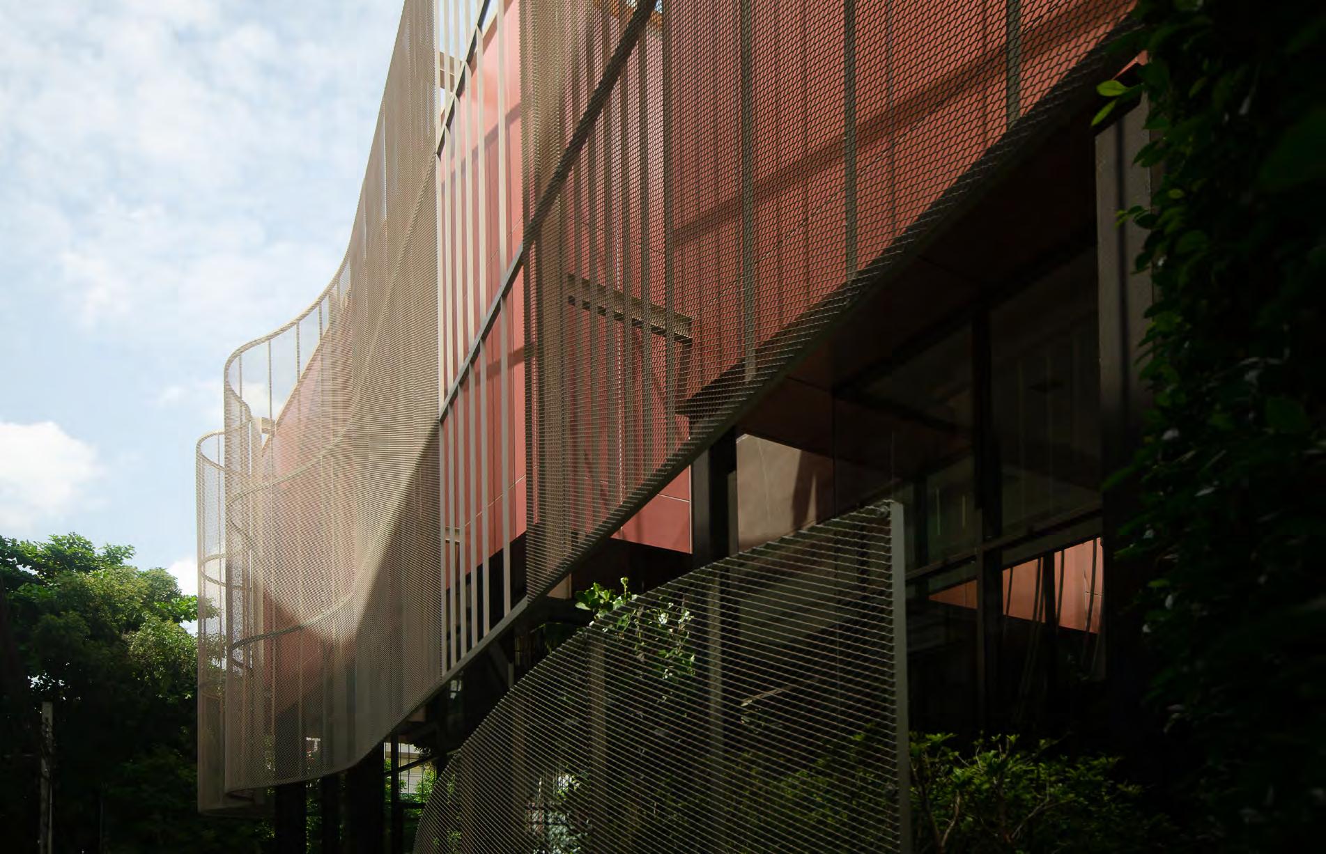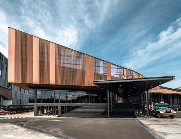 The first impression of the architecture start with a familiar sharp angle forms, symbolising the form of timber wedged in the old lumber days. The external materials are mostly in metal cladding, and standard size trellis section in a few shades of timber brown colours. Even the entrance grand staircase is all in steel, creating the industrial impression of factories and productions. It is ironic that industrial metallic based materials could come together with the right use of shapes, forms and colours, to form an undeniable identity and impression of timber business.