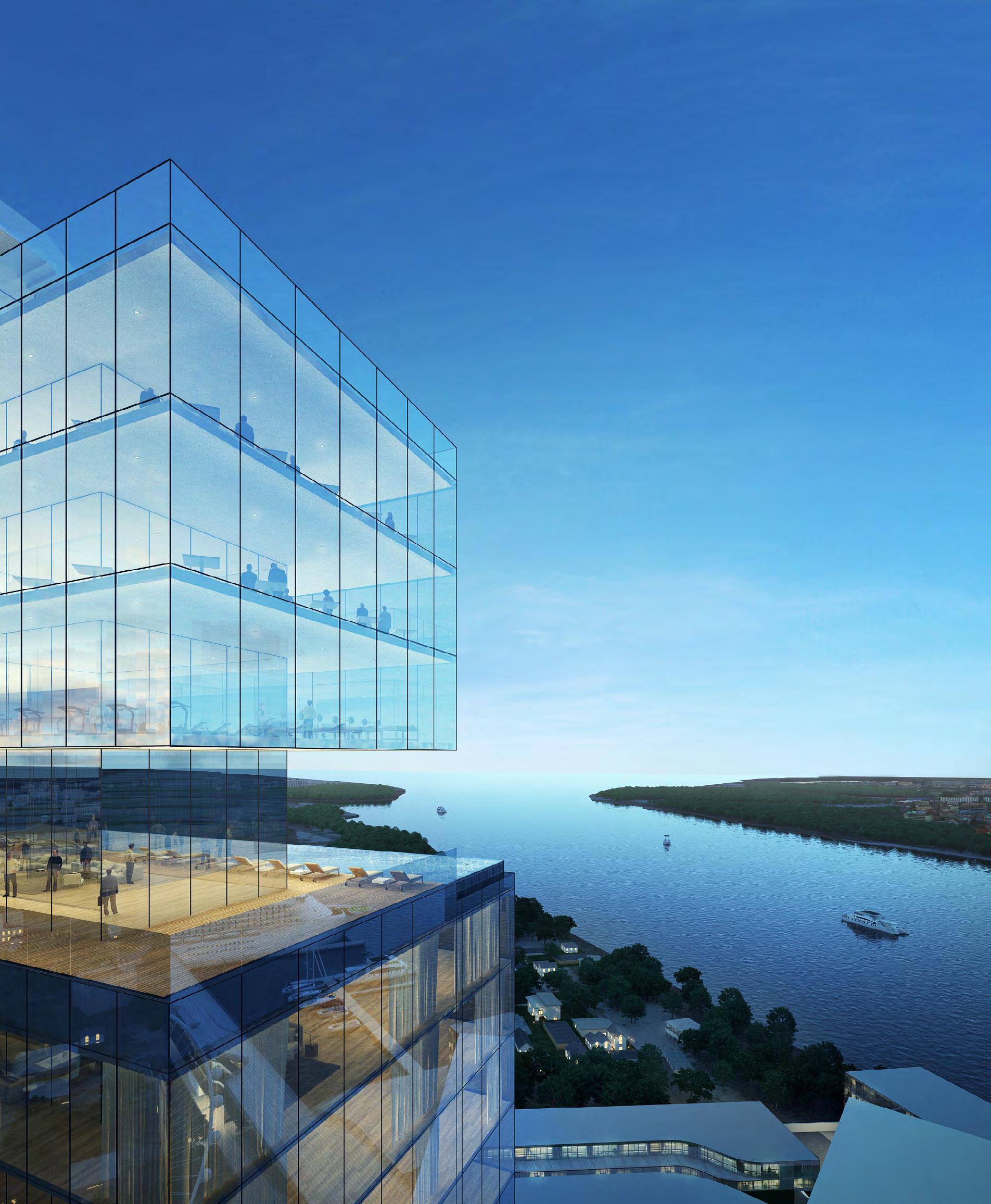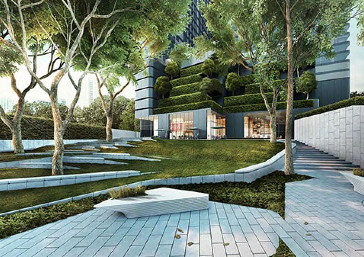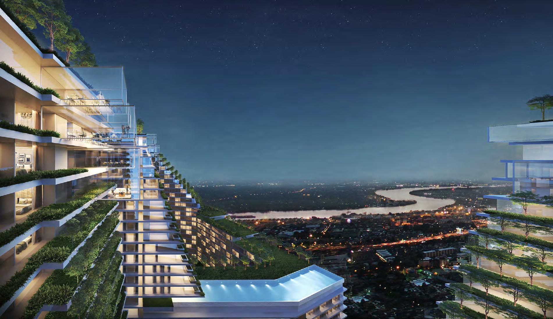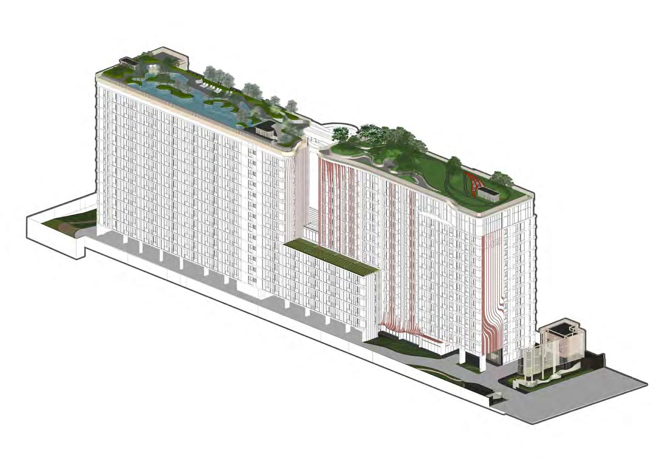 The concept of Tropical High Rise is then applied to the design. The first tropical feature is unique horizontal shading fins. They help to reduce glare and shield large windows from rain. Gradient of fins thickness create a dynamic touch to the overall composition and a refreshing touch to the skyline.