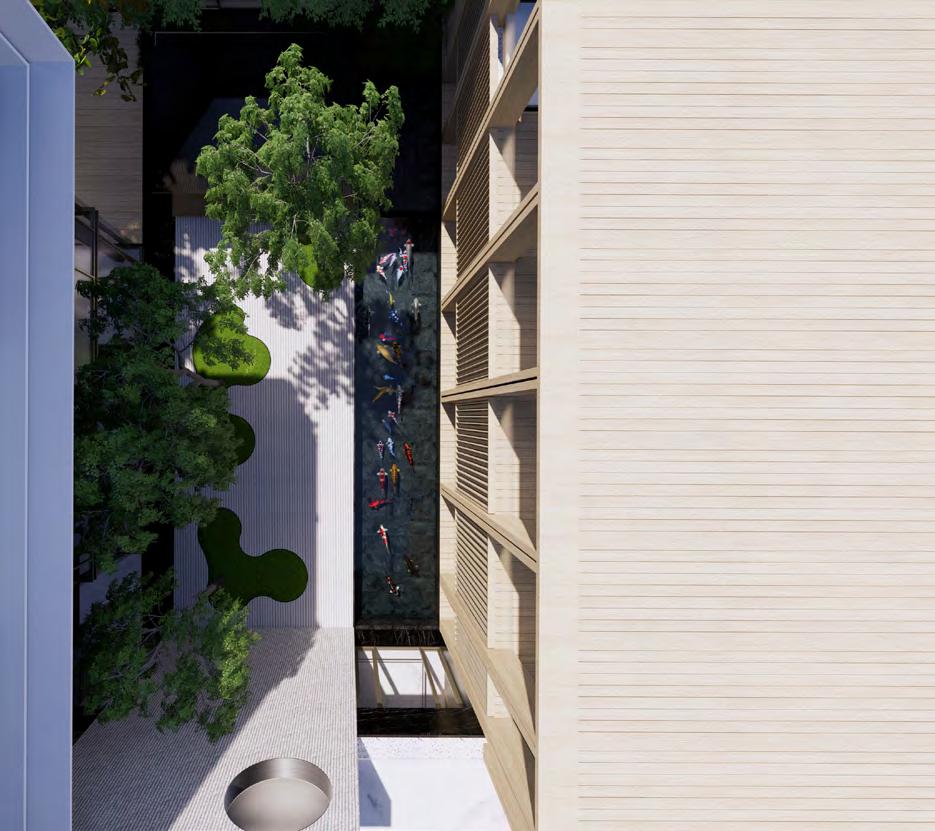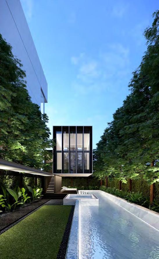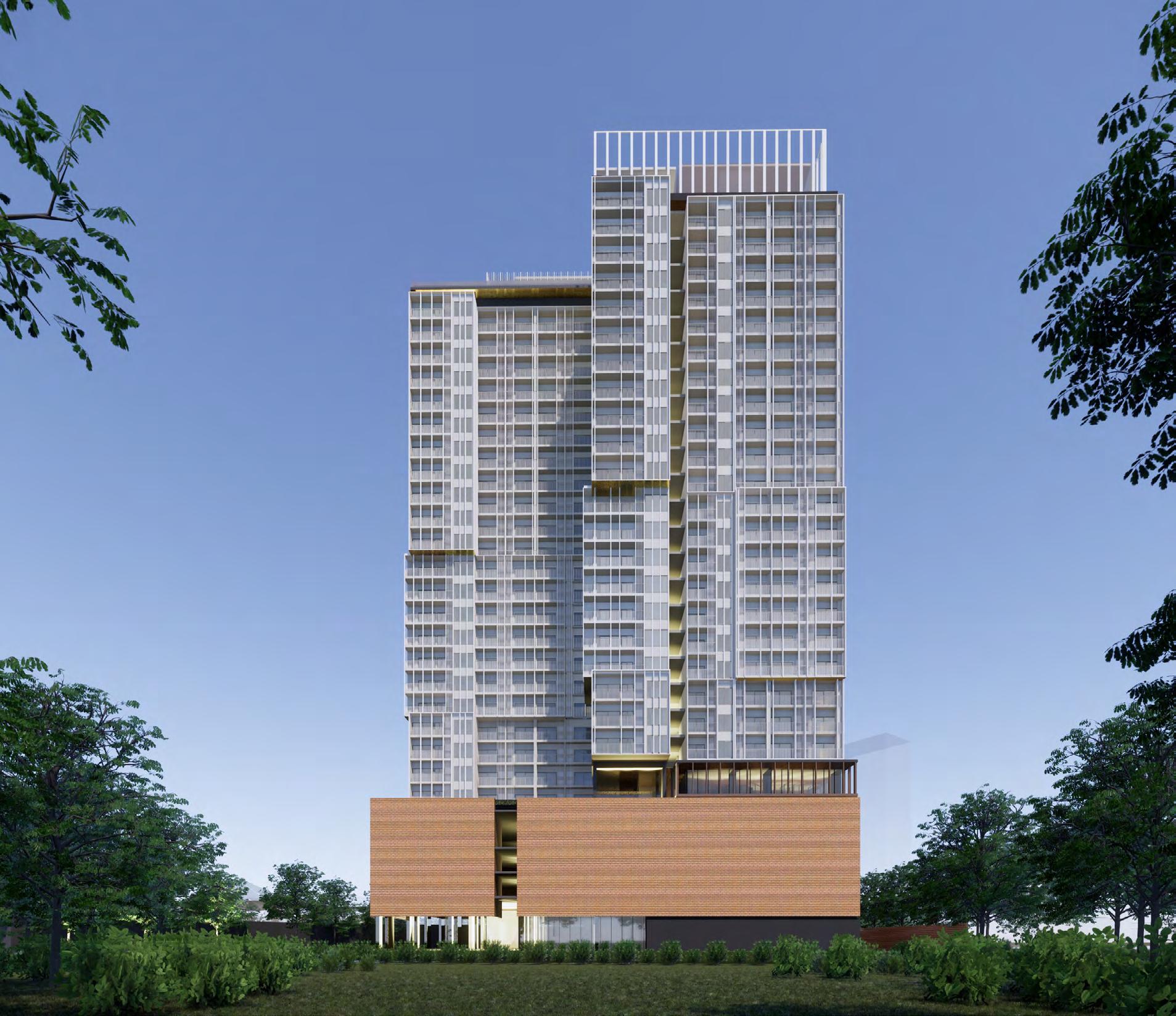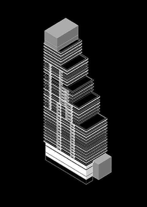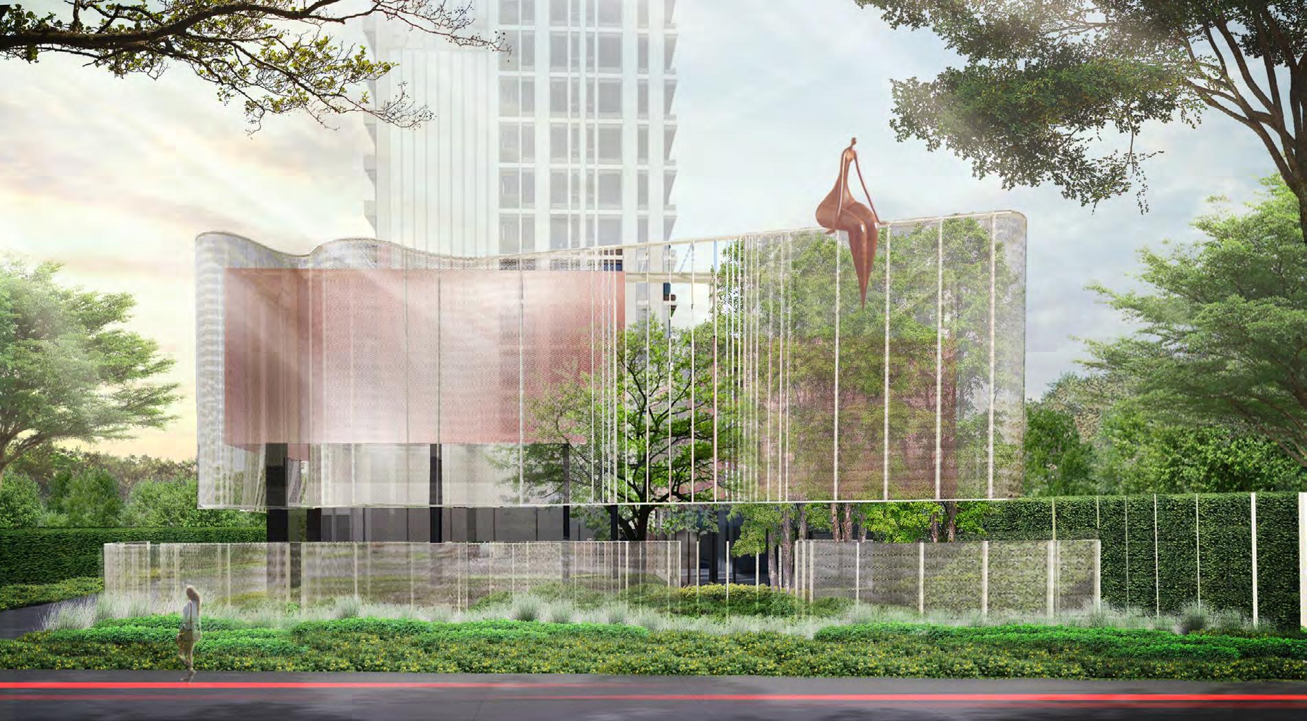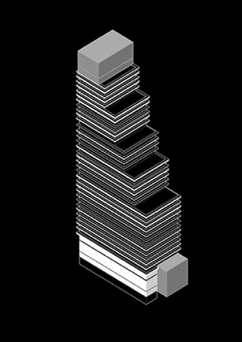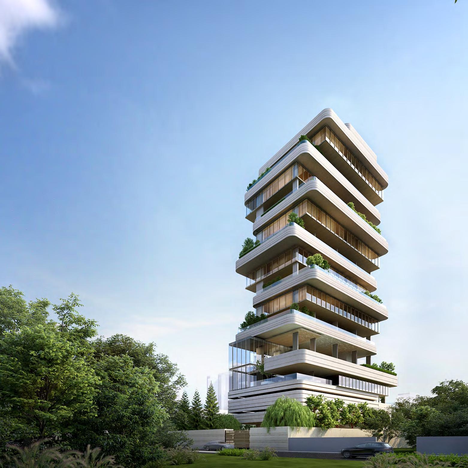 The concept of Tropical High Rise is then applied to the design. The first tropical feature is unique horizontal shading fins. They help to reduce glare and shield large windows from rain. Gradient of fins thickness create a dynamic touch to the overall composition and a refreshing touch to the skyline.