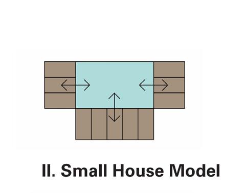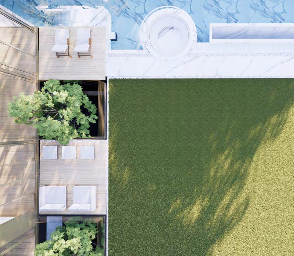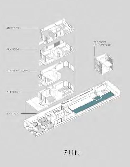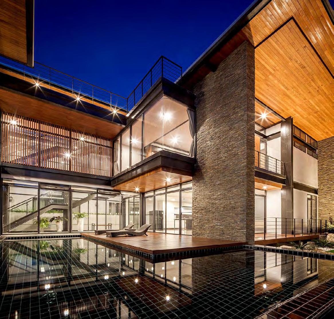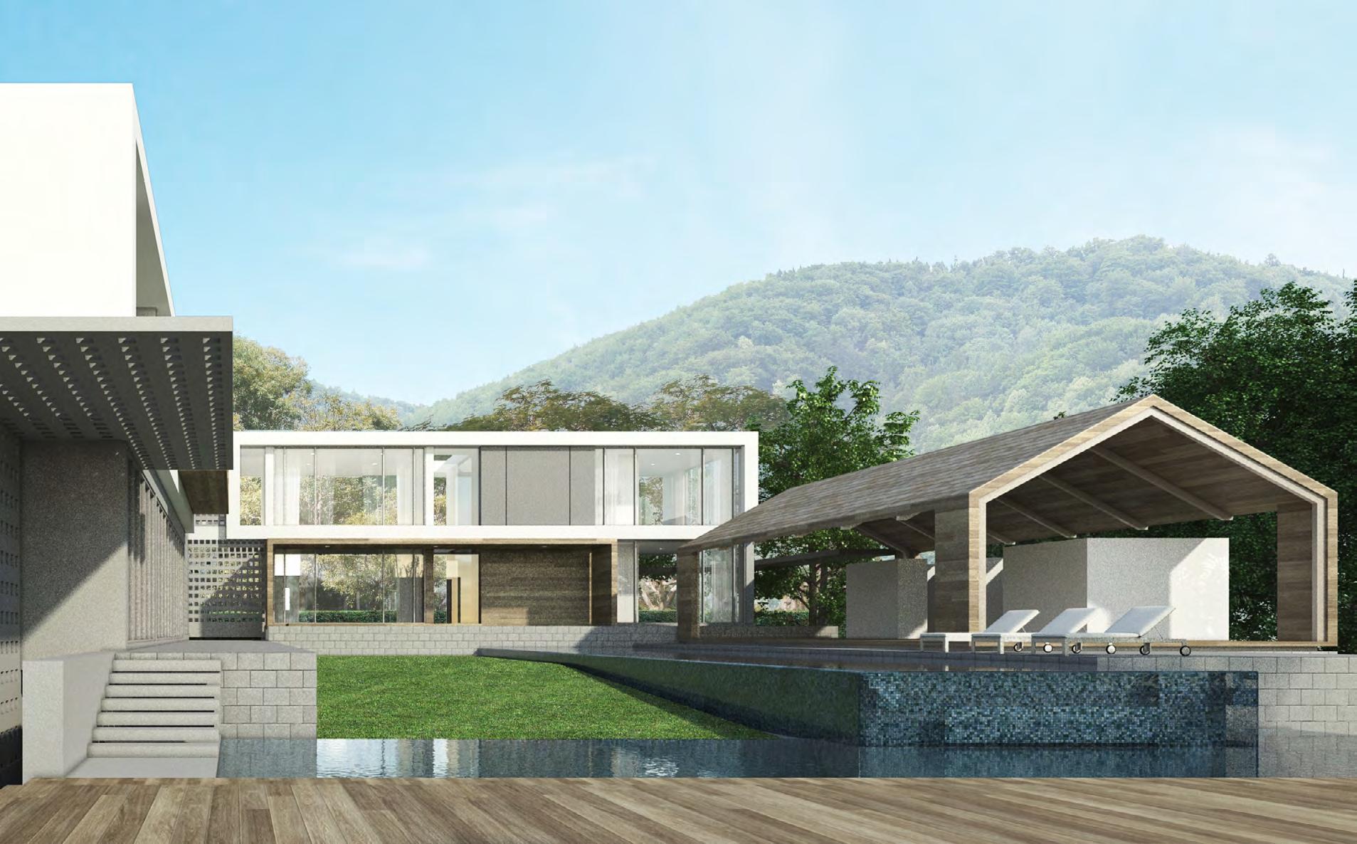 According to the existing contour and vacation home design concept, after zoning design (3 wings) we put the parking lots, service rooms, and mechanical rooms under the house and swim ming pool pavilion at the highest level of the site that makes the family wings have more privacy with the mountain view. The swimming pool is design to 2 levels to make “White noise” from water over flow that related to the Meditation Room at Central wings