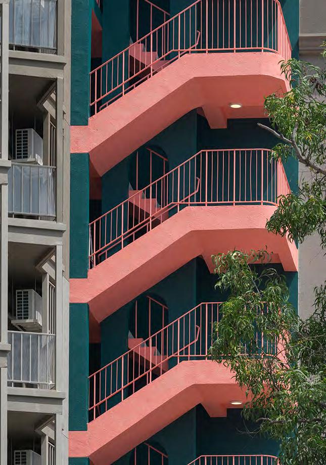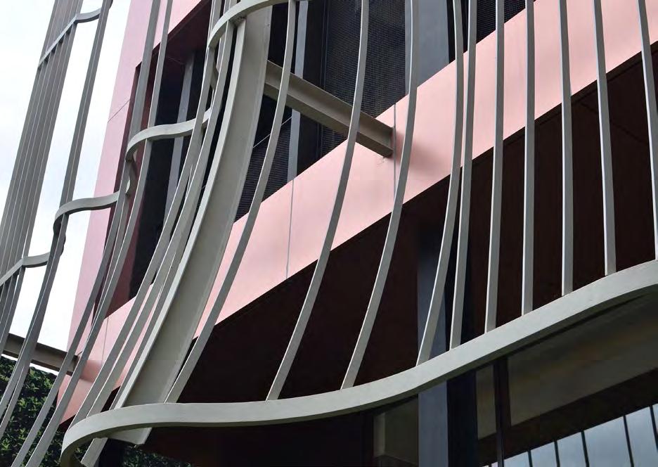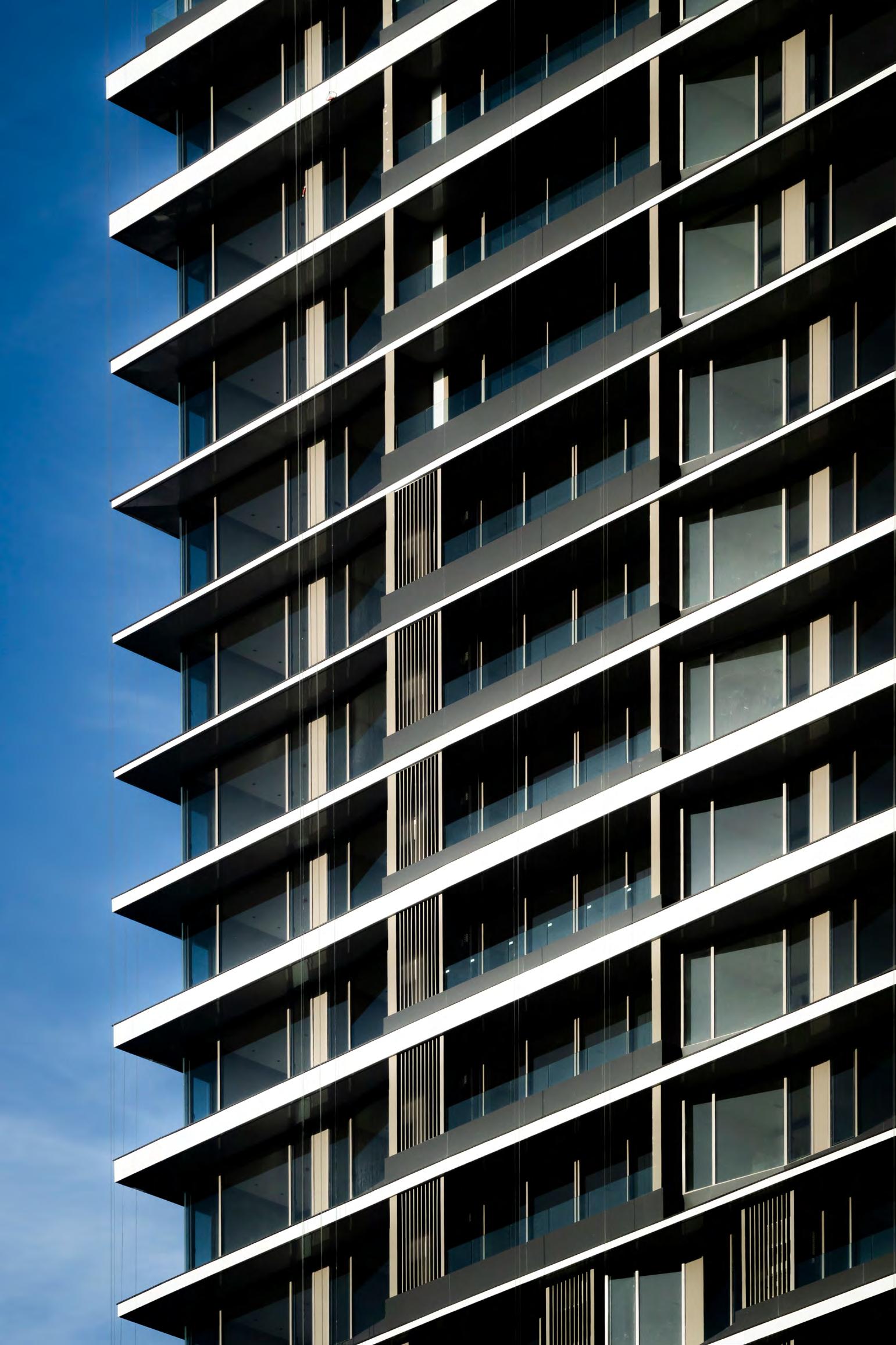 Angled bay window is another feature that responds directly to complexity of urban surroundings, residential preference and tropical orientation. In simple words, all windows tilt and turn individually towards the best view, away from obstructing neighbors and excessive Sunlight. The result is a complex texture on the façade, reflecting sky colors from different angles inserted between horizontal fins. This also creates Angles Bay Window space which is surprisingly functional and very unique from inside residential units.