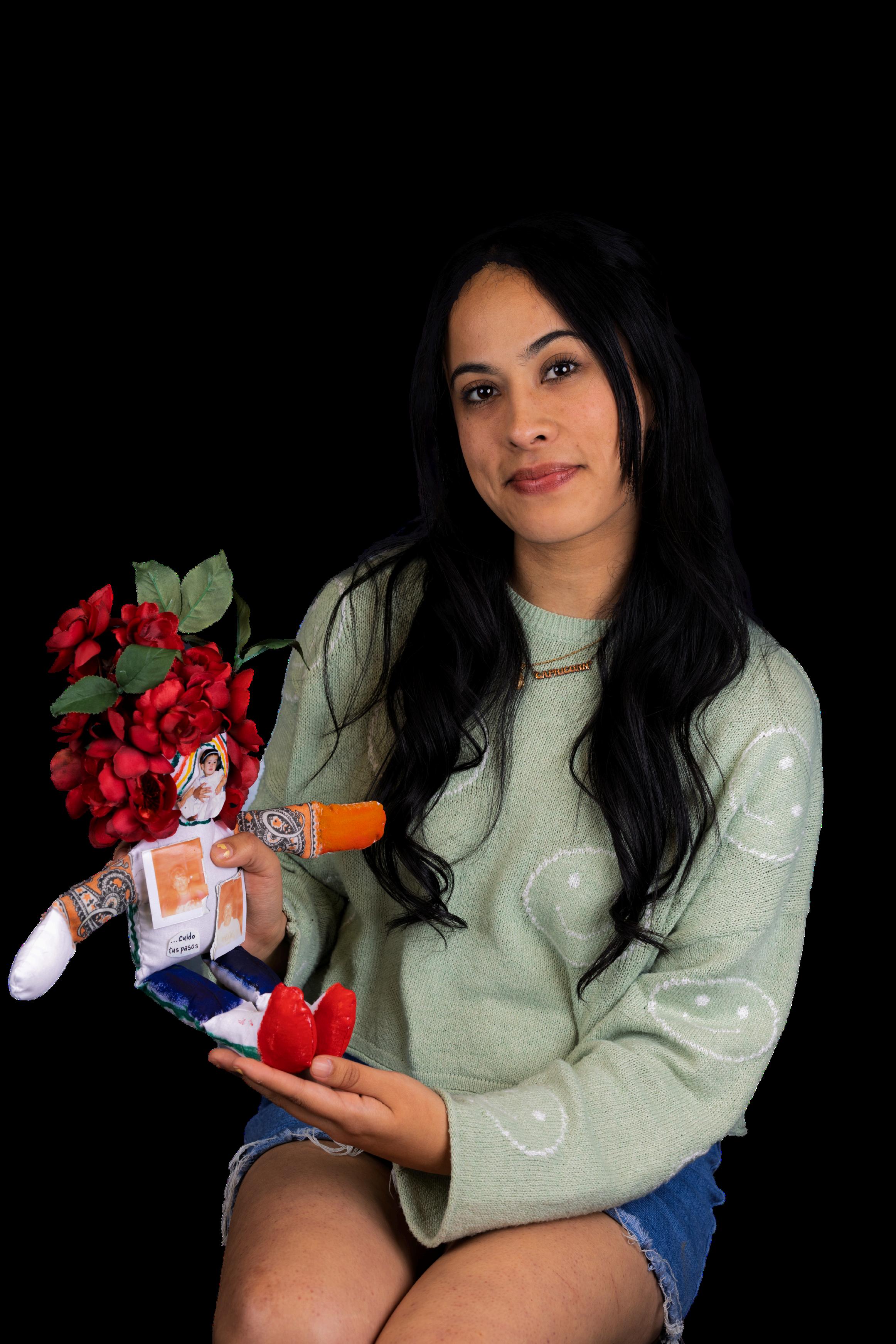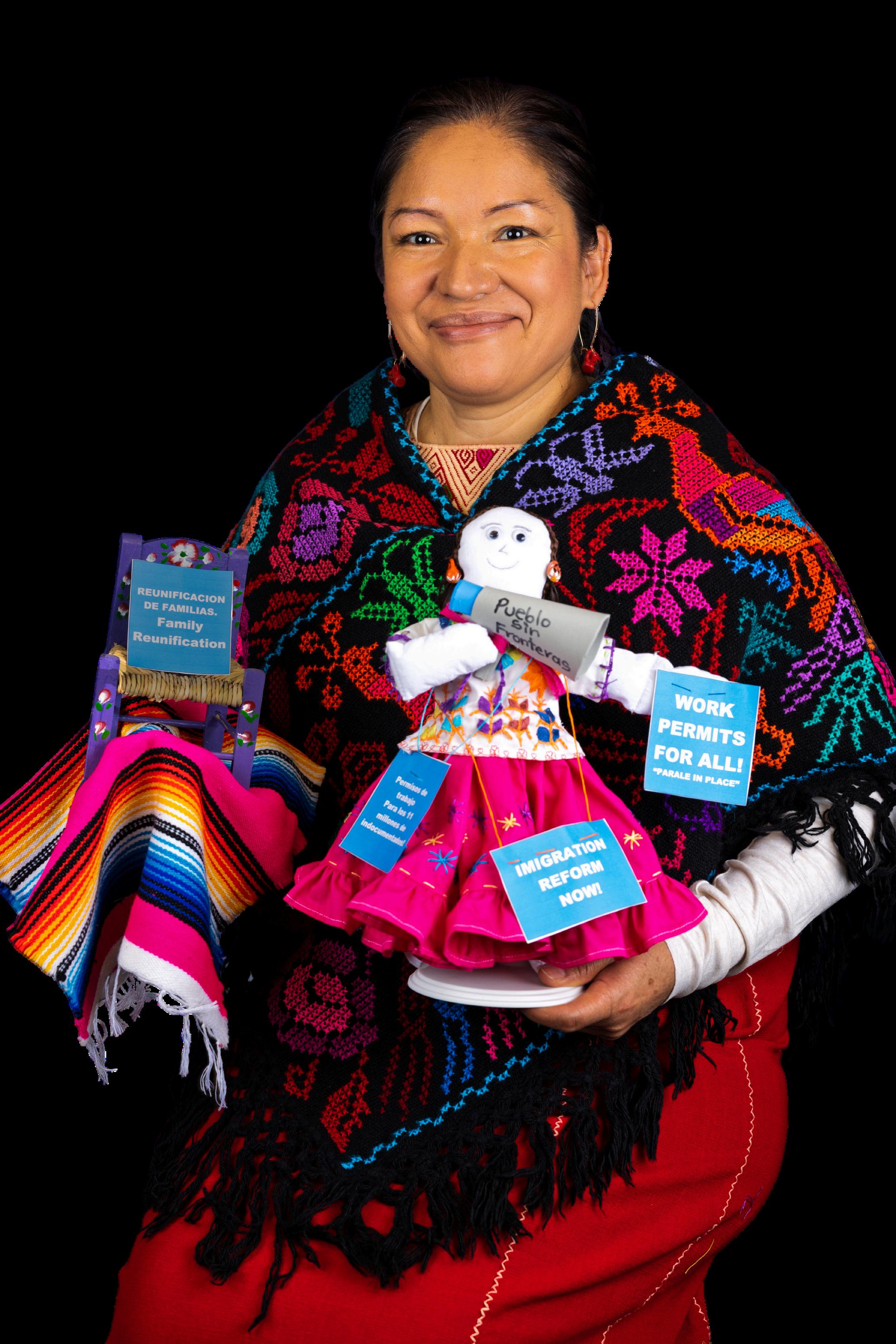 “Miavatarrepresentalaluchaporlajusticiasocialpara11 millonesdeindocumentadosquellevandécadasesperando unareformamigratoria Suvozespoderosayelmegáfonoleda fuerzaparaserescuchada Laspancartasrepresentanlas causasporlasquemuchasmujereshemosluchadodurante décadas.Elhuipildaidentidad,recordándonosdedóndevenimos yhaciadóndevamos,ysimbolizalaculturamexicana.Los mexicanoscreemosquesomoshijosdelmaíz—cadarama delmaízrepresentanuestrasfamilias Lafaldarepresenta nuestralibertad.Lasestrellasrepresentanaloshombres ymujeresindocumentadosquemurieronacausade COVID-19,asícomoelcaminoquerecordemoslos inmigrantesparallegaralosEstados Unidos Lasillavacíarepresentaalos inmigrantesquehansidoseparadosde susfamilias,aloshombresymujeres quenoregresaronacasa.”