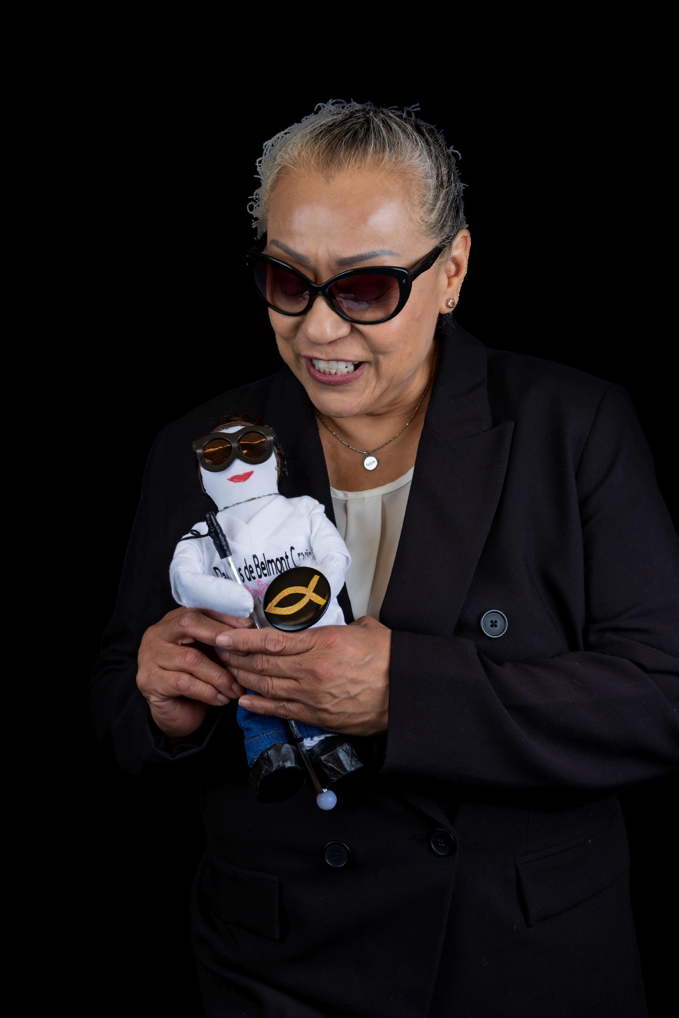“Iamhonoredtosharemystorywithyou.Iamathird-generationMexican American,thedaughterofRachelMireles,whowasorphanedasachild.My braid,alifelongcompanion,connectsmetomyheritageandrootsinthe indigenoustradition.AlthoughIdon'thaveadornments,mybraidholdsdeep meaning—it'sareflectionofmystrengthandidentity.AsInavigatelifewith blindness,mycaneandsunglassesserveassymbolsofresilience,whilemy shieldremindsmeofmyfaith,guidingmeeachday.Mybluenecklace,a feather,representshope—ahopeIcarrywithmealways.Wearingmy"Las DamasdeBelmontCragin"shirt,Irepresentmybeloved organization,committedtosupportingourcommunityand upliftingthoseinneed.”