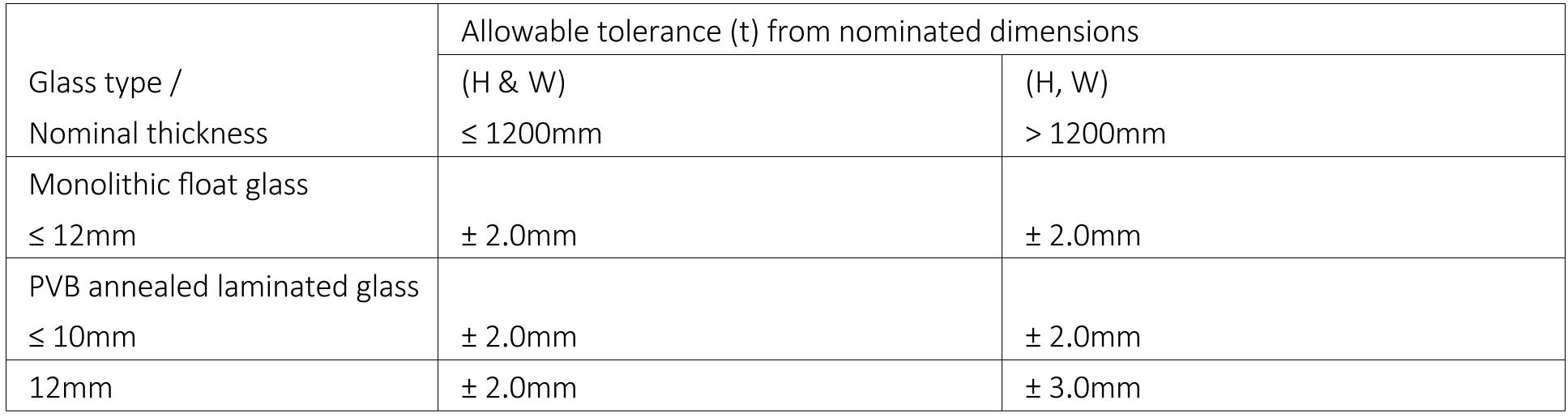 Table 2 – Allowable dimensional tolerances for individual glass panes.