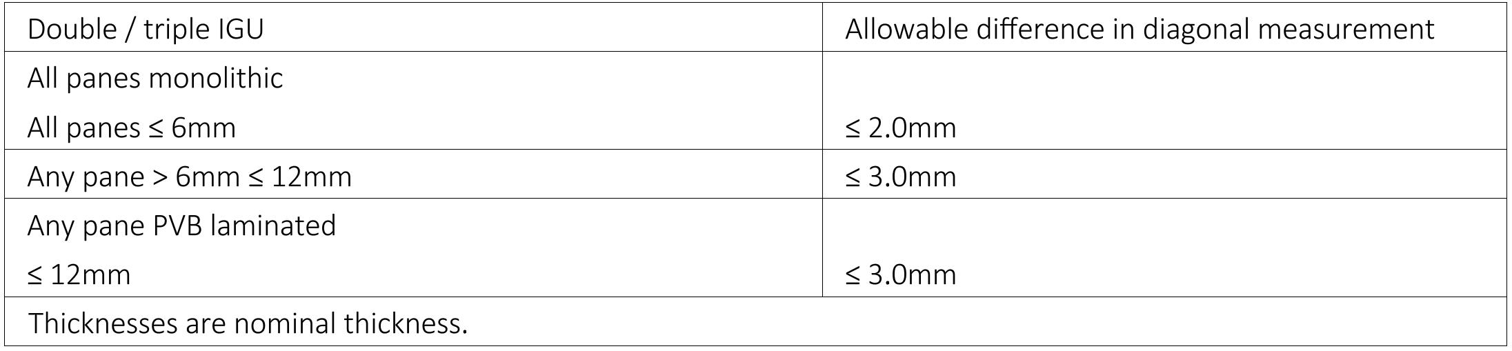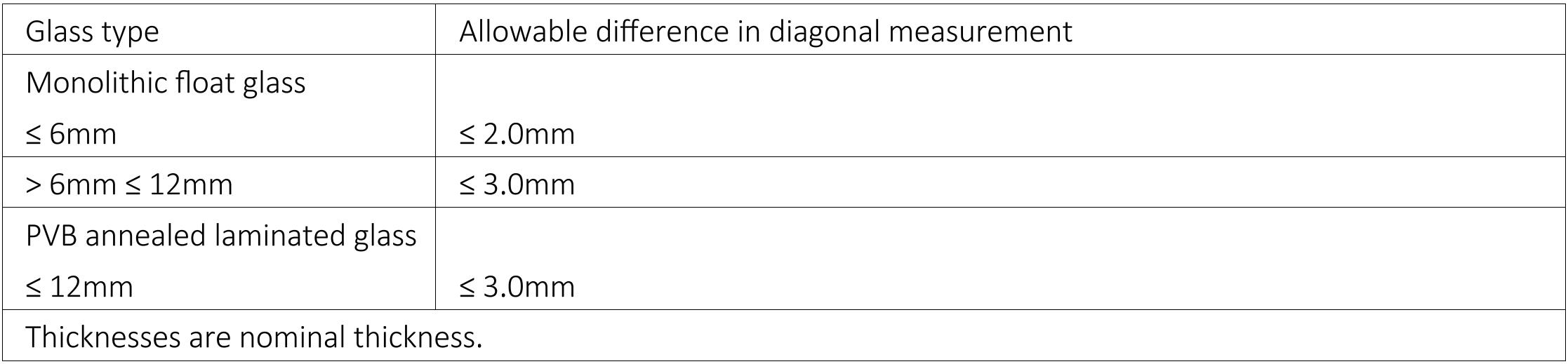 Table 4 – Allowable diagonal difference for an individual glass pane.