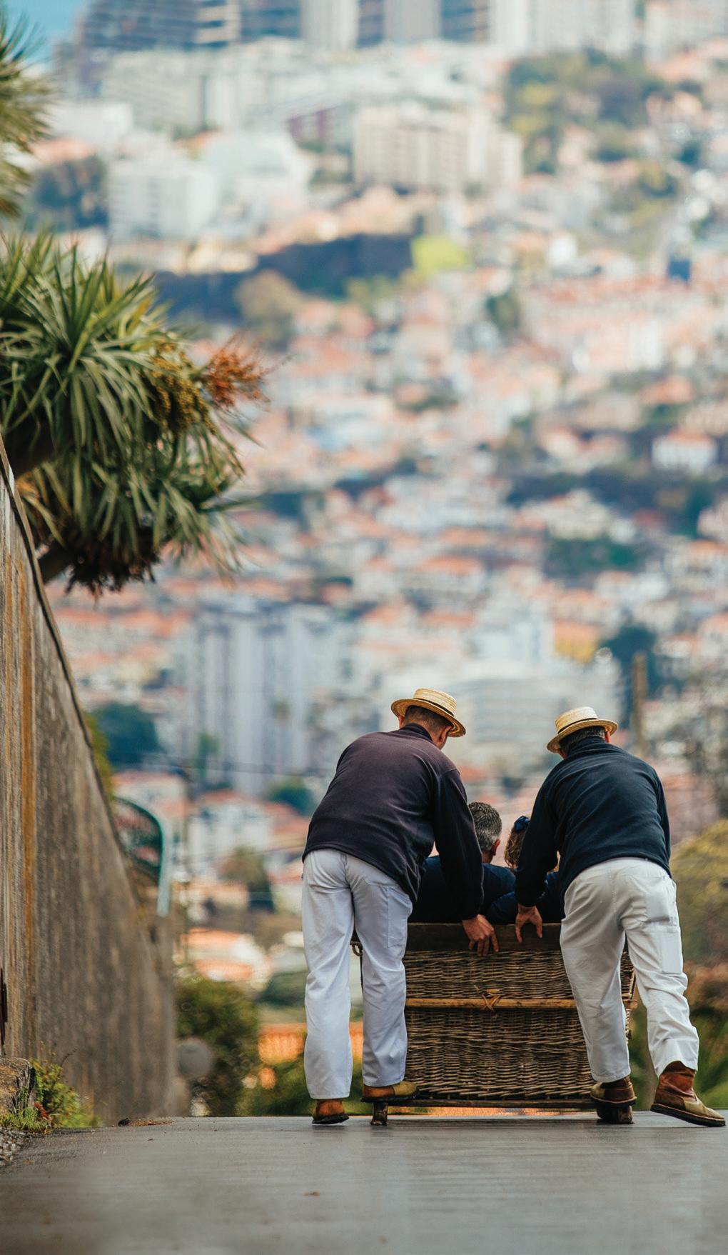 Sie sind eines der Aushängeschilder Madeiras Die aus Holz und Weide gefertigten Korbwagen rutschen die steilen Straßen der Stadt hinunter.