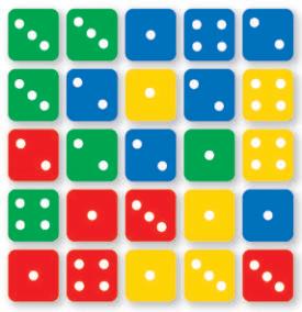 Each colour represents a direction (up, down, left or right) and the number of dots on each die tell you how far to go Starting in the middle, follow the directions correctly and you will visit every die in turn once only Which dice is the last you visit on your trip?