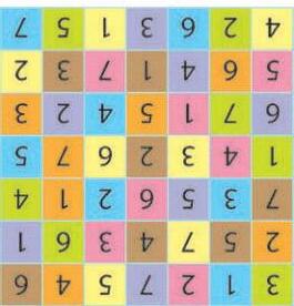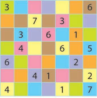 Complete the Myriad grid so that all the rows and columns, and all squares of the same colour, contain the numbers 1 to 7.