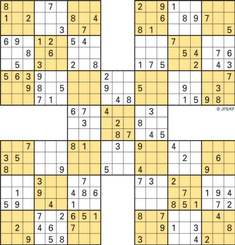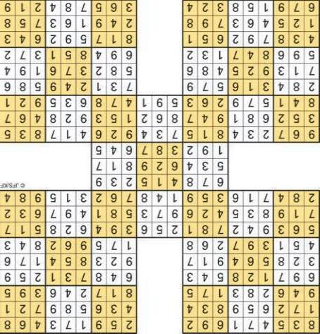 These five 9x9 puzzles work in the same way as a single sudoku - each 3x3 box, each row and each column requires the numbers 1-9 But, in addition, where a 3x3 box is shared between two puzzles, the numbers in that box must work for both puzzles
