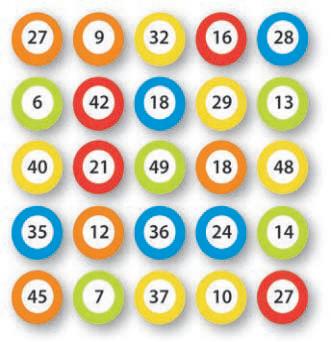 None of the five winning balls is yellow, and none is divisible by seven, or contains digits that add up to nine Can you find the fortunate five?