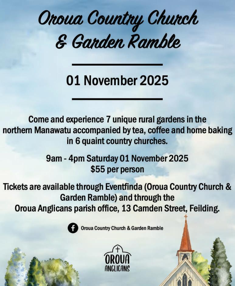 Oroua Country Church & Garden Ramble 9am – 4pm Oroua Parish Hall 16 Camden St Feilding Info feilding co nz, 06 323 4026