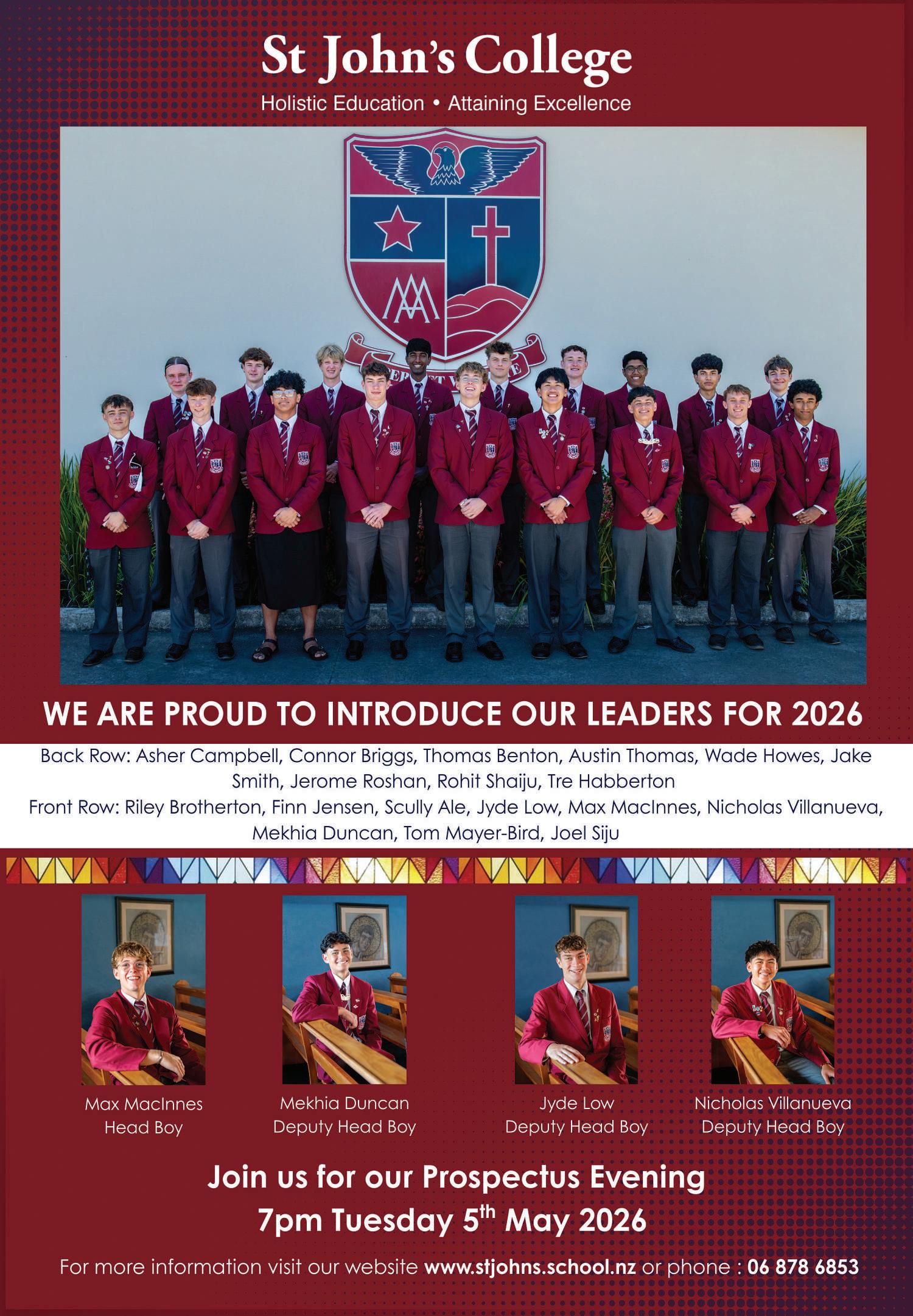 INSIDE:Hawke’sBaySecondarySchoolsproudlyintroduce studentleadersintheirschoolsfor2026. Theserepresentativesarerecognizedfortheirstrengths, values,responsibilitiesandleadershipskills.