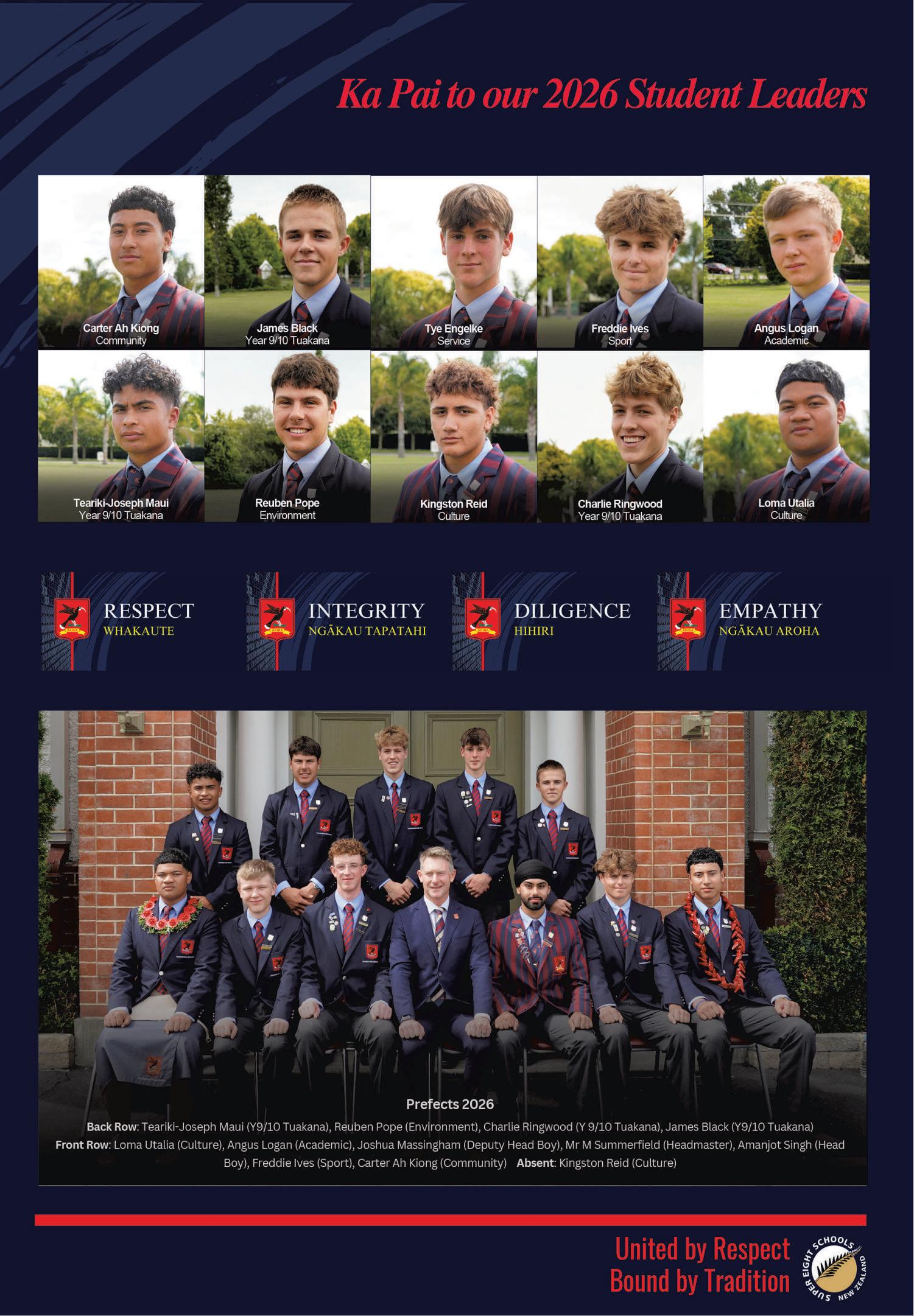 Leadershipopportunitieshelpboysdevelopintoresponsibleyoungmen.OurYear13prefectsare ourseniorandmostvisibleleaders.Prefectsorganiseandsupportimportantschoolevents,plan studentactivitiesandassiststaffintheorganisationofprogrammesthroughouttheyear.Tobe chosenasaprefect,boysmustbeofgoodcharacter,embodyingourĀkinaManvaluesofRespect (Whakaute),Integrity(NgākauTapatahi),Diligence(Hihiri),andEmpathy(NgākauAroha).My personalcongratulationsgoestoeachoftheyoungmenwhohavebeenselectedforour2026 Prefectteam.