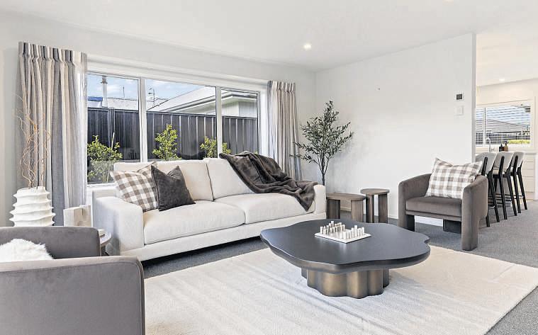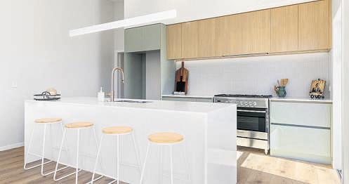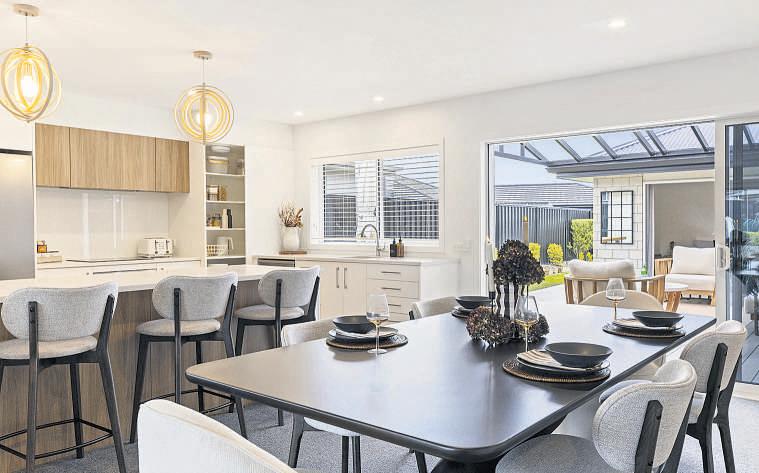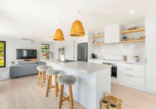 TheblackIntegrapanelandboard-and-battenexteriorgivesthehomeinstantcurbappeal,whileinsideit’swarm, light,andbright.Thecontemporaryislandkitchenisthesocialheartofthehouseconnectingtheopen-plandining andlounge,withnorth-facingslidersandoversizewindowscapturingplentyofsun.