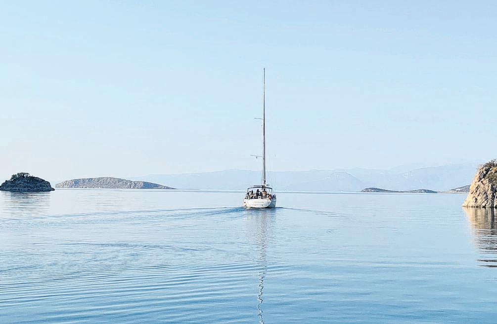 morning, as “Captain Phil” unfurled the sails, we made our way peacefully towards the popular marina at Trizonia the only inhabited island in the Corinthian Gulf