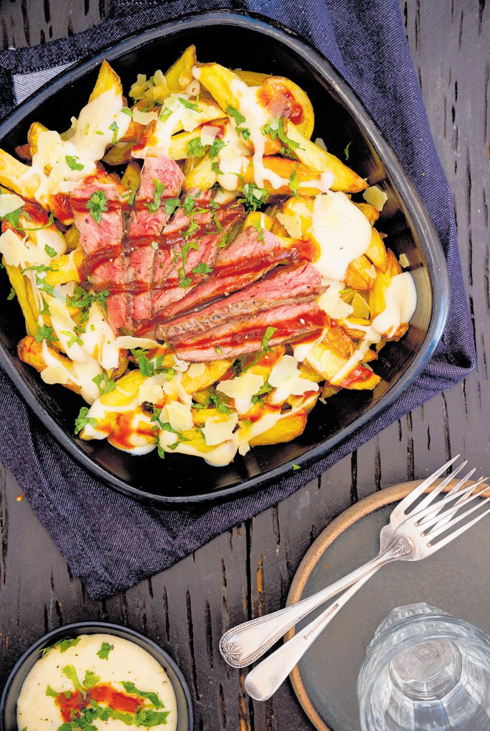 5 Place the chips in a serving dish Top with cheese and barbecue sauces, then add the thinly sliced steak Finish with a sprinkle of parsley