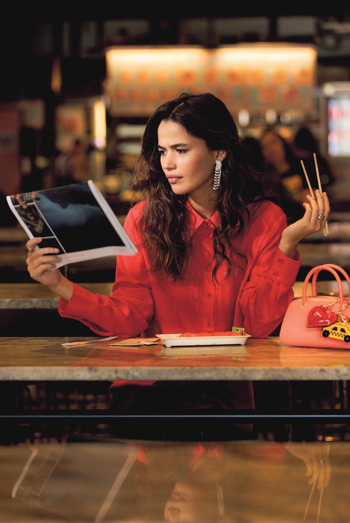 Lunch on the run? Opt for daytime decadence in bright red silk and sparkling drop earrings