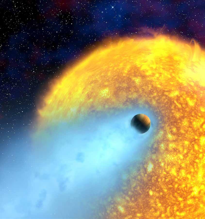 KAUGE ILMASTIK. 2001. aastal suutsid astronoomid esmakordselt mõõta eksoplaneedi ümber atmosfääri. Sellel kunsti-teosel on kujutatud planeet Jupiteri sarnase maailmana oma tähest vaid 6 miljoni kilomeetri kaugusel olevana. G. BACON/STScI