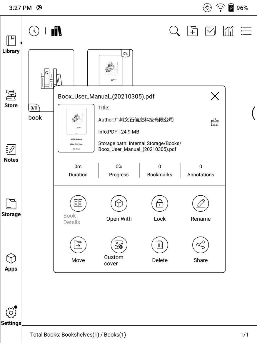Lisateabe saamiseks E-raamatu nime, autori, vormingu, suuruse, lugemise edenemise, raamatu üksikasjade (saadaval ainult poe e-raamatute jaoks), tee avamise, lukustamise, ümbernimetamise, (alamteeki) liigutamise ja kustutamise jaoks vajutage pikalt raamatu kaaneikoonil. Ühte alamteeki saab lisada ainult ühe e-raamatu.