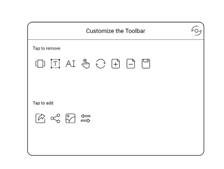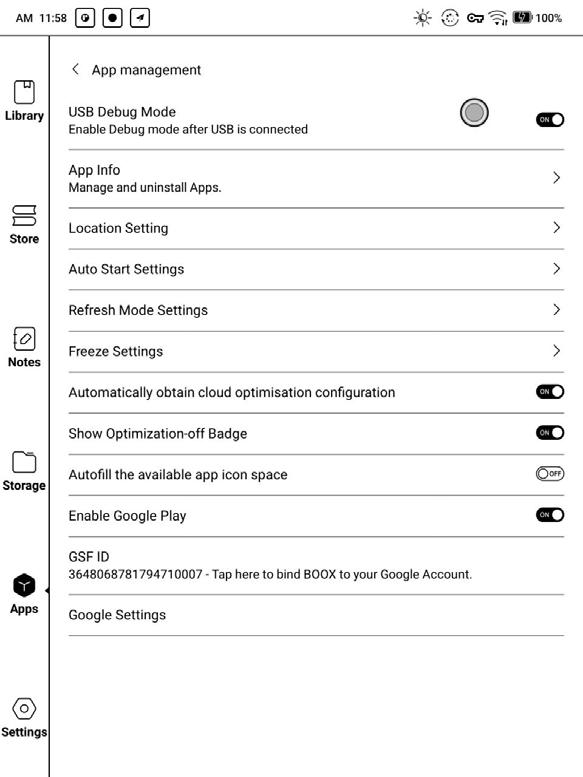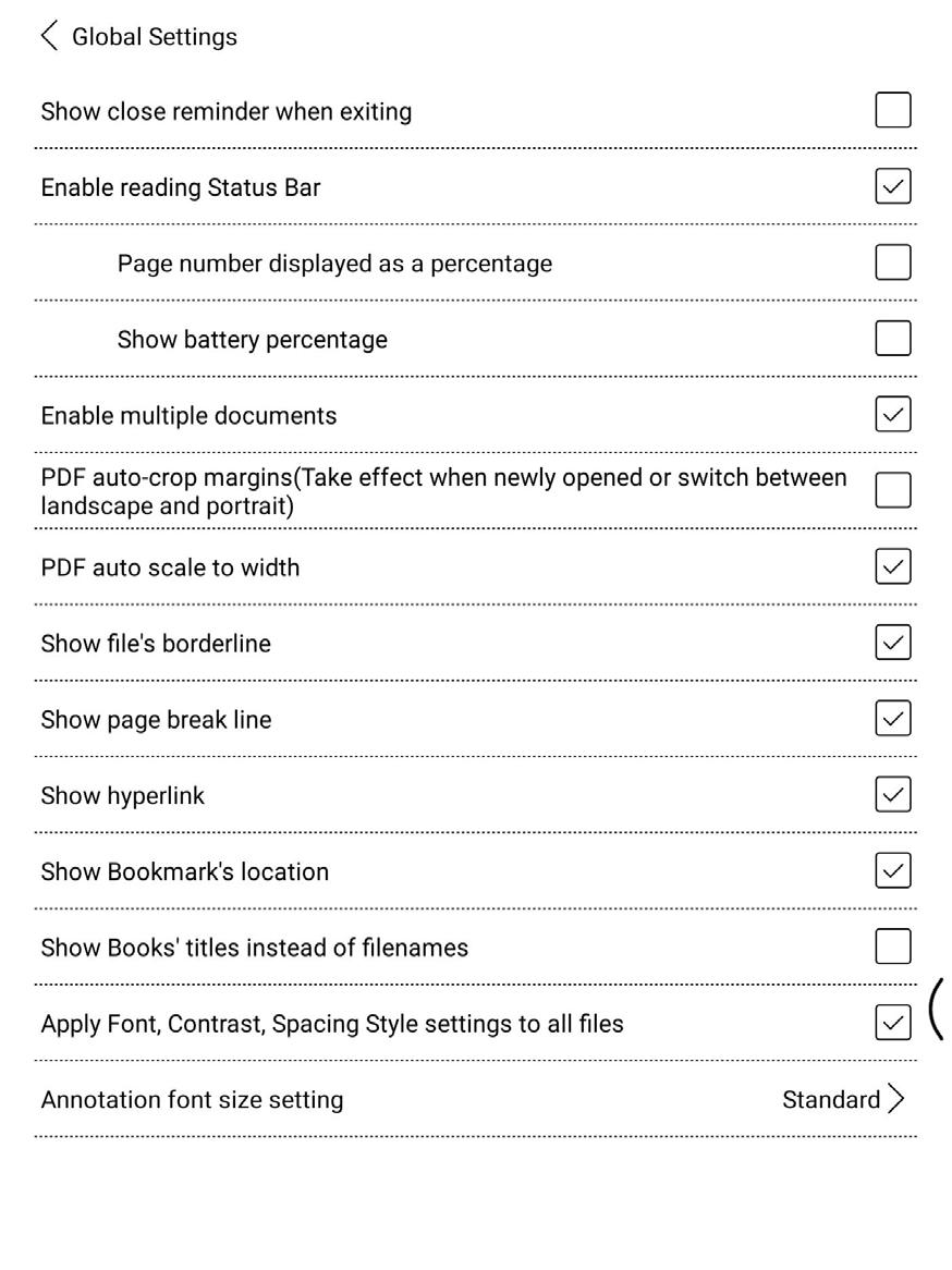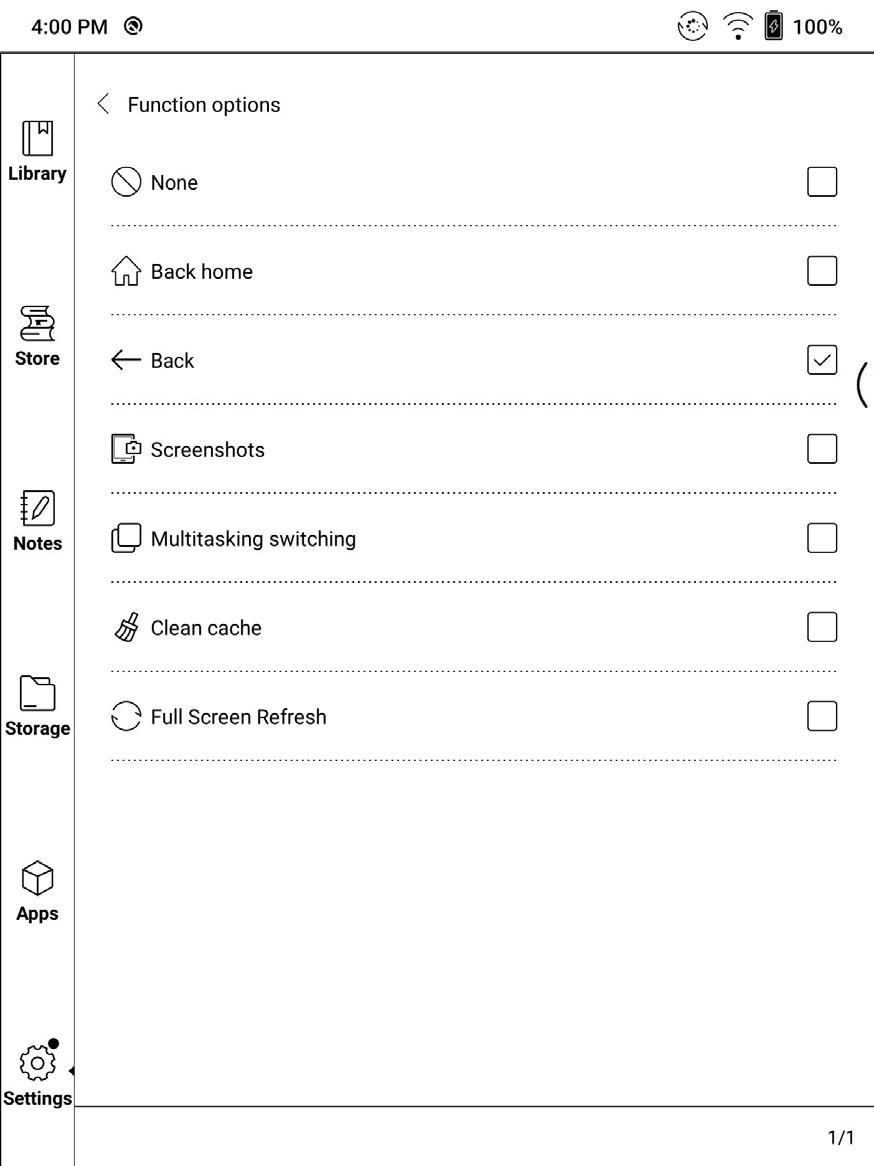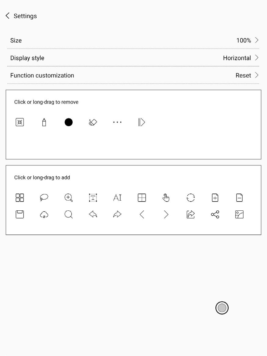 Ekraani orientatsioon, käsitsi puudutamine sisse/välja, ekraaniviisor, ekraanisalvestis, poolitatud ekraan, BooxDrop ja tagasiside on valikulised elemendid. Neid on võimalik redigeerida.