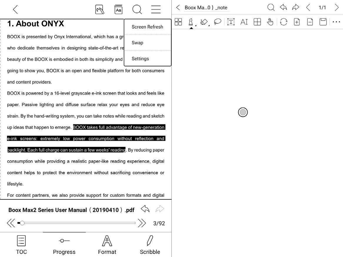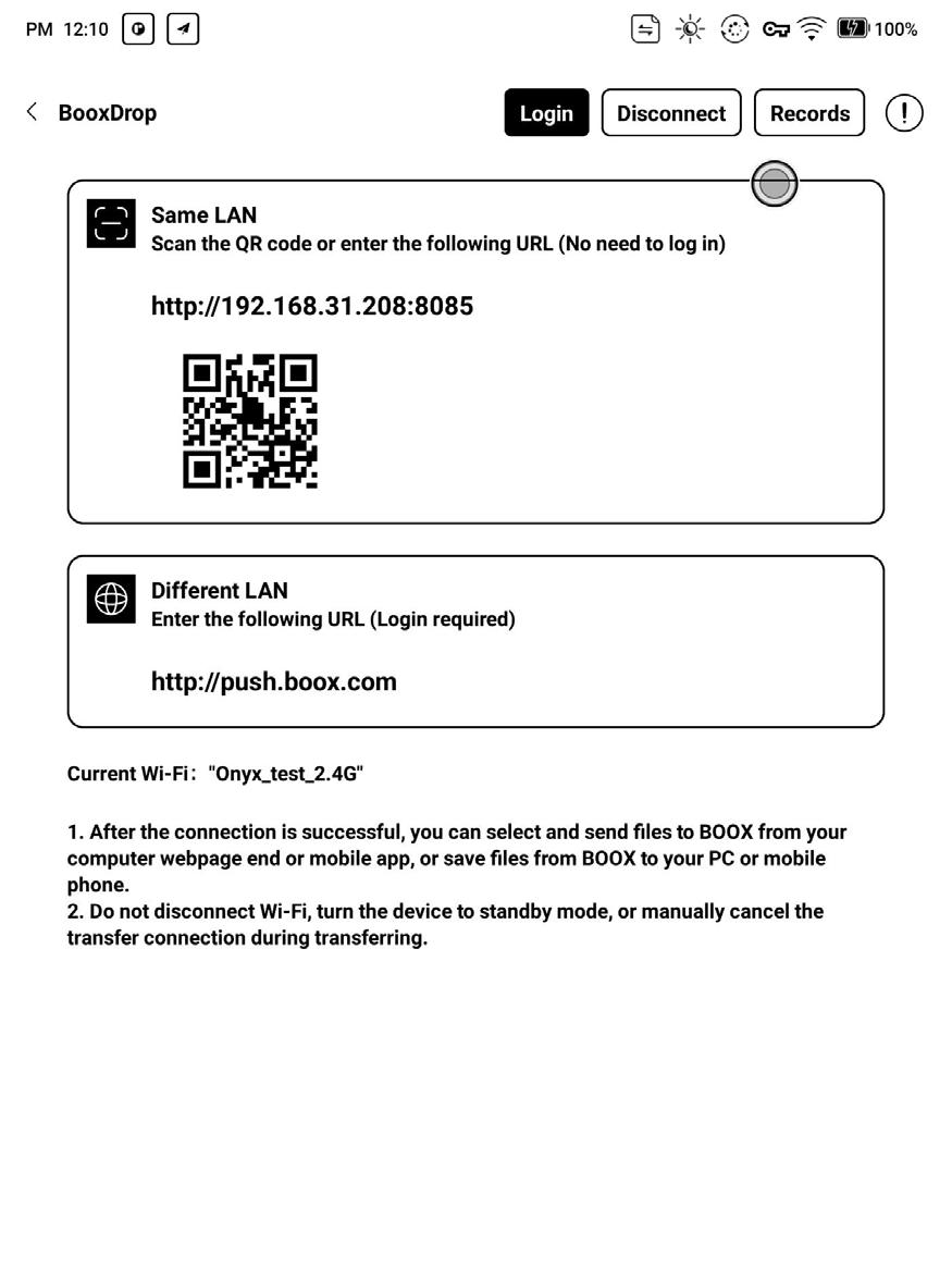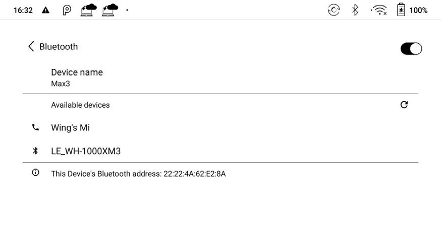 Bluetooth tuleb enne kasutamist siduda. Praegu toetatakse ainult eReaderit dokumentide vastuvõtmiseks. Dokumentide saatmist Boox-i eReaderist teistesse seadmetesse ei toetata.