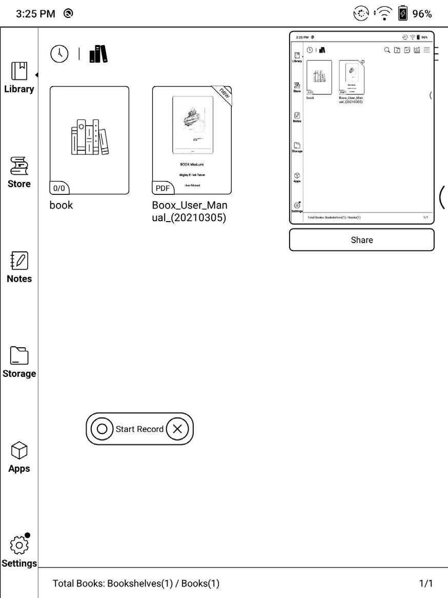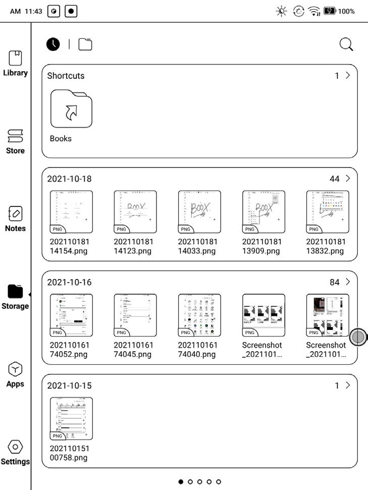 Teek kuvab ainult sisemälus toetatud vormingus olevaid e-raamatuid/ dokumente. Raamatukaane pisipilt kuvatakse vaikimisi. E-raamatud sorteeritakse loomise aja järgi.