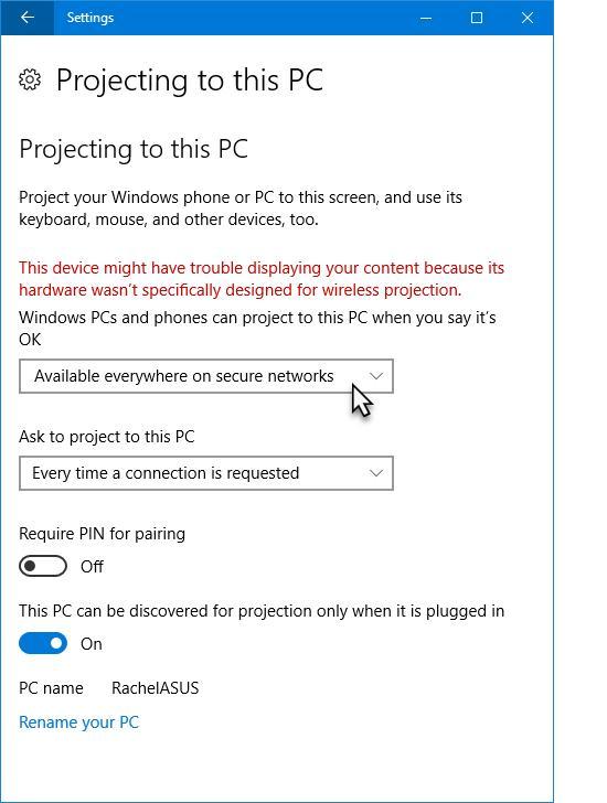 Pöörake tähelepanu neljale seotud sättele, mis mõjutavad arvuti otsimise tulemusi seadme poolel ja ühendustaotluse kinnitamist; See arvuti võib toetada ekraani projektsiooni olekut