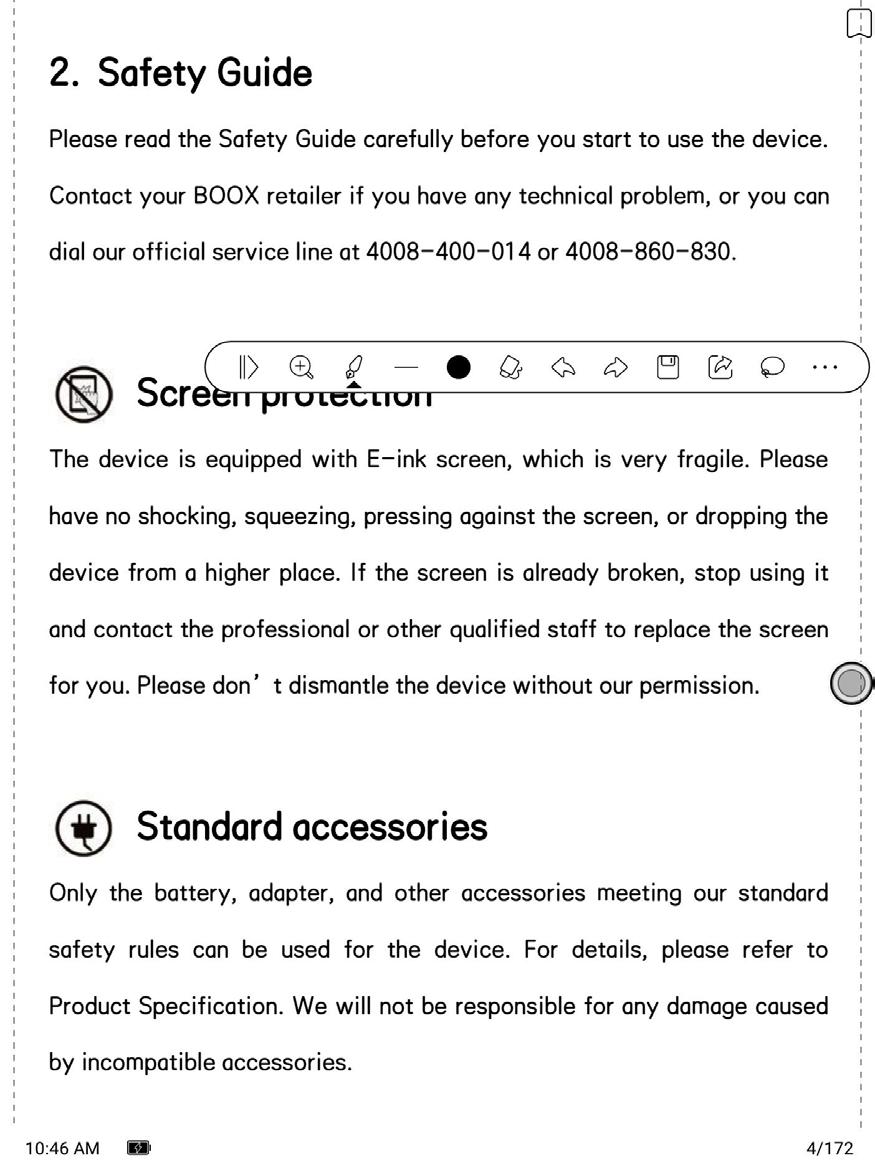 Enne seadme kasutamist lugege ohutusjuhend hoolikalt läbi. Tehniliste probleemide korral võtke ühendust oma BOOXi edasimüüjaga või helistage meie ametlikule teenindusliinile numbritel 4008-400-014 või 4008-860-830.