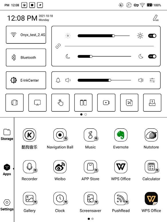 See on mõeldud Wi-Fi \VPN\Bluetoothi seadistamiseks. Kui Wi-Fi on ühendatud, saavad kasutajad sirvida veebi ja laadida raamatuid seadmesse Interneti kaudu.