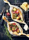 • Vormi küpsetuspaberist 4 kompvekikujulist pakki. Aseta ahjurestile. Jaota võiga segatud aedviljad ühtlaselt pakkide vahel ära. Küpseta ahju keskosas, kuni kõik on läbi kuumutatud, u 15 minutit.