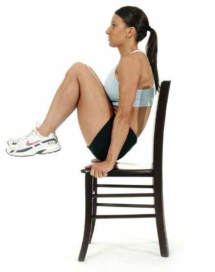 3 Viige õndraluu tooli serva ja põlved rinna poole. Samal ajal kõverdage küünarnukke. Liigutuse lõpus lükake küünarnukid sirgeks ja viige keharaskus kätele.