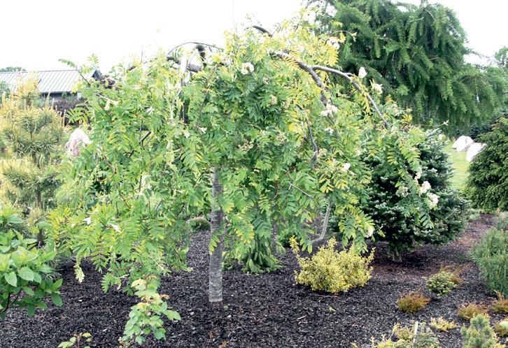 x Koheva võraga harilik pihlakas ’Pendula’ täidab hästi aiaruumi. Tema pikki oksi kärbitakse lühemaks.