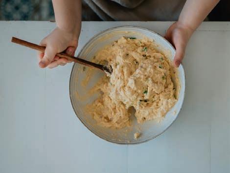 3 Sulata potis või ja vala kaussi. Lisa juurde kee r, munad, riivitud sink ja juust ning hakitud maitseroheline. Sega korralikult läbi.