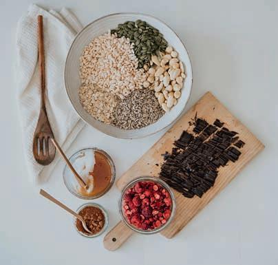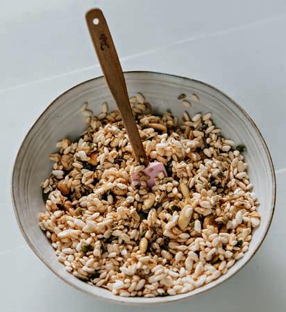 2 Pane kaussi paisutatud riis, kaerahelbed, kõrvitsa- ja päevalilleseemned ning pähklid.